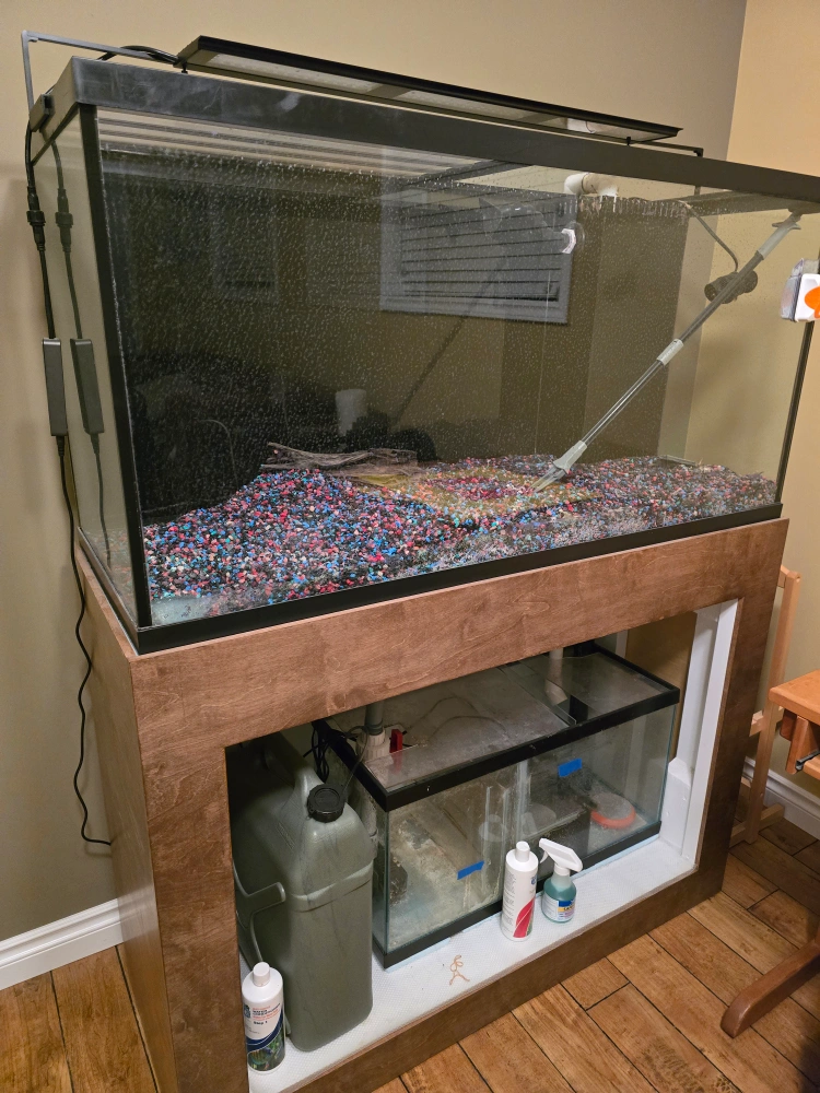 90 gallon aquarium with 20 gallon filter sump, heaters, LED lights, and custom built stand. Includes additional water jug and automatic water top-up pump. Perfect setup for fresh or saltwater aquariums.