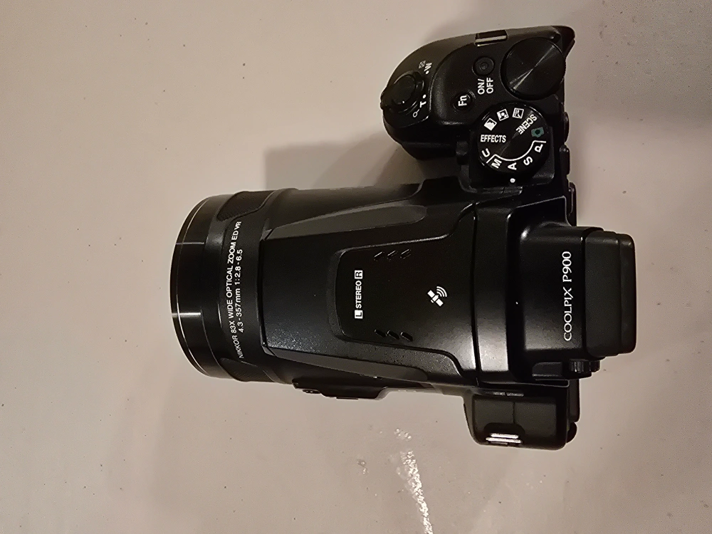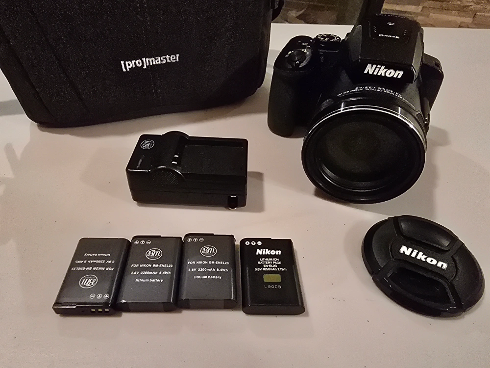 Selling a Nikon Coolpix P900 camera. It comes with a ProMaster camera bag, charger, lens cap, and four batteries. Great for photography enthusiasts!