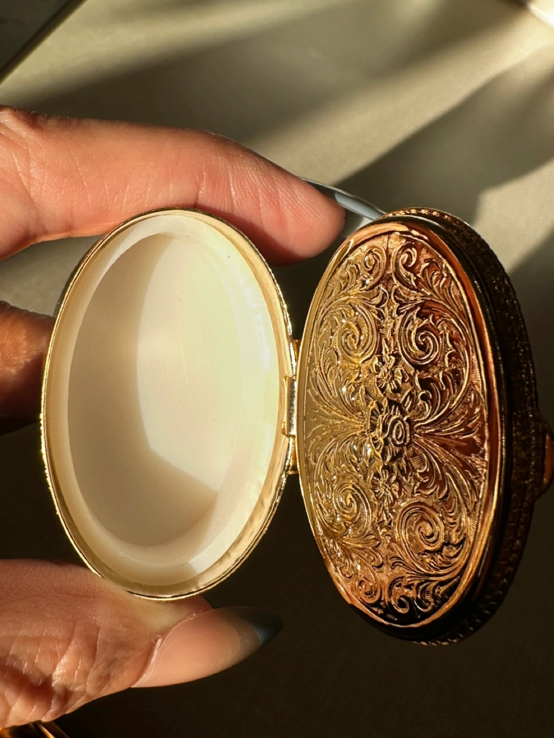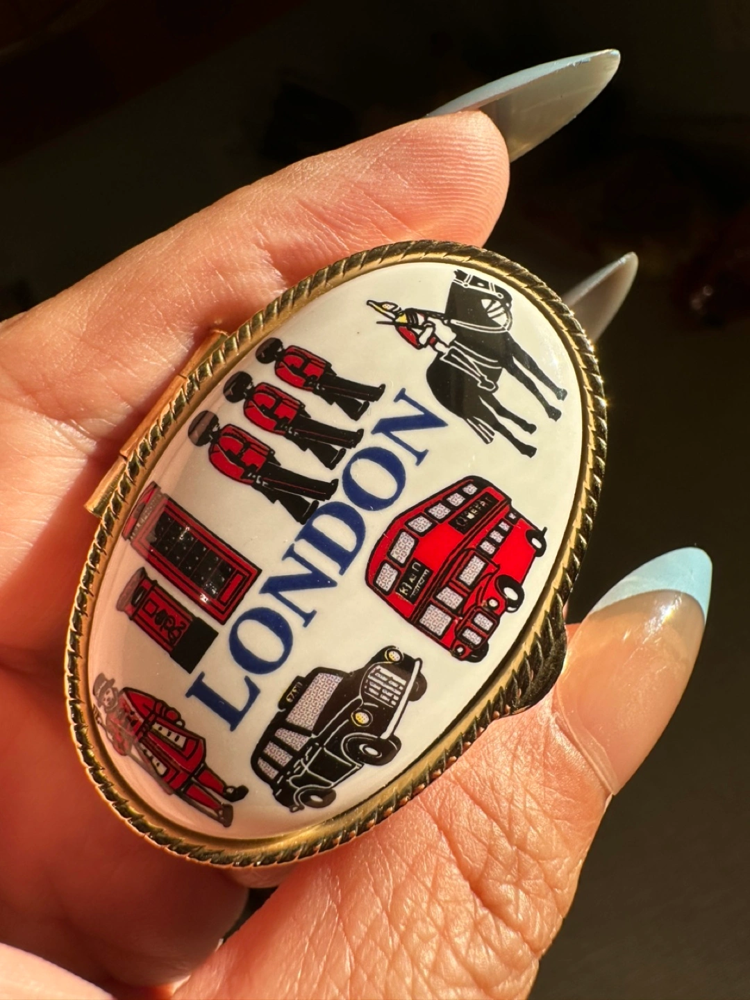Selling a lovely vintage gold tone pill box. It features a detailed design on the top and a London souvenir theme on the bottom. Perfect for small items or as a decorative piece!