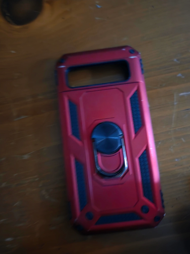 Selling a red phone case with a built-in ring holder! It has a rugged design and looks great. There are some small scratches on the top.