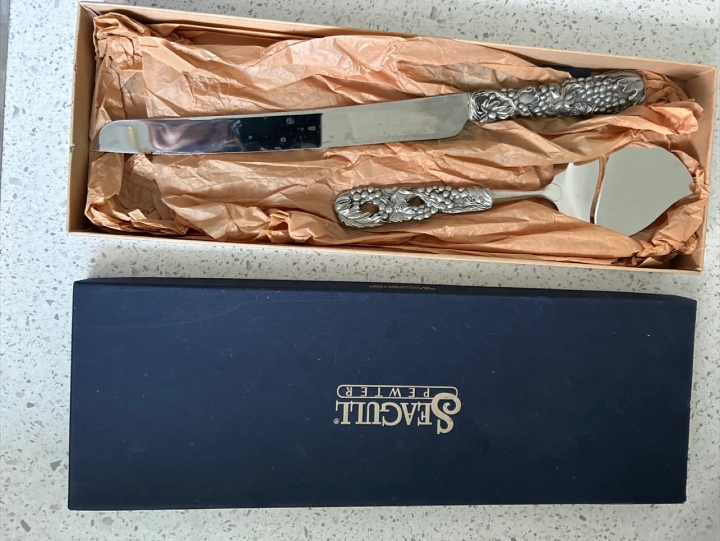 Selling a lovely cake knife and server set from Seagull Pewter! The set is in its original box and looks like it's never been used. Perfect for special occasions or adding a touch of elegance to your dessert table