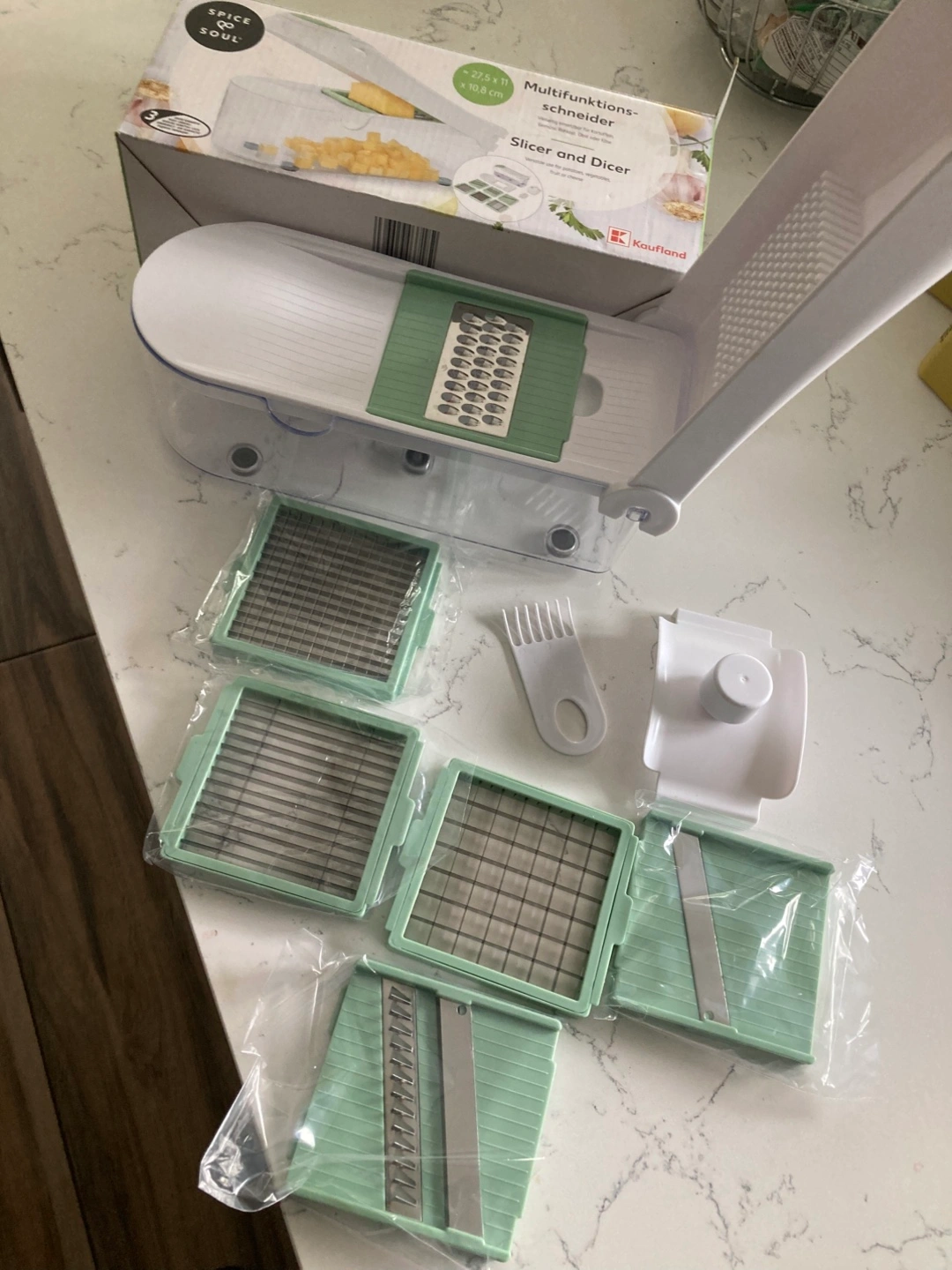 Selling a Spice & Soul Multifunktionsschneider Slicer and Dicer. It comes with multiple attachments for different slicing and dicing options. The box is also included!