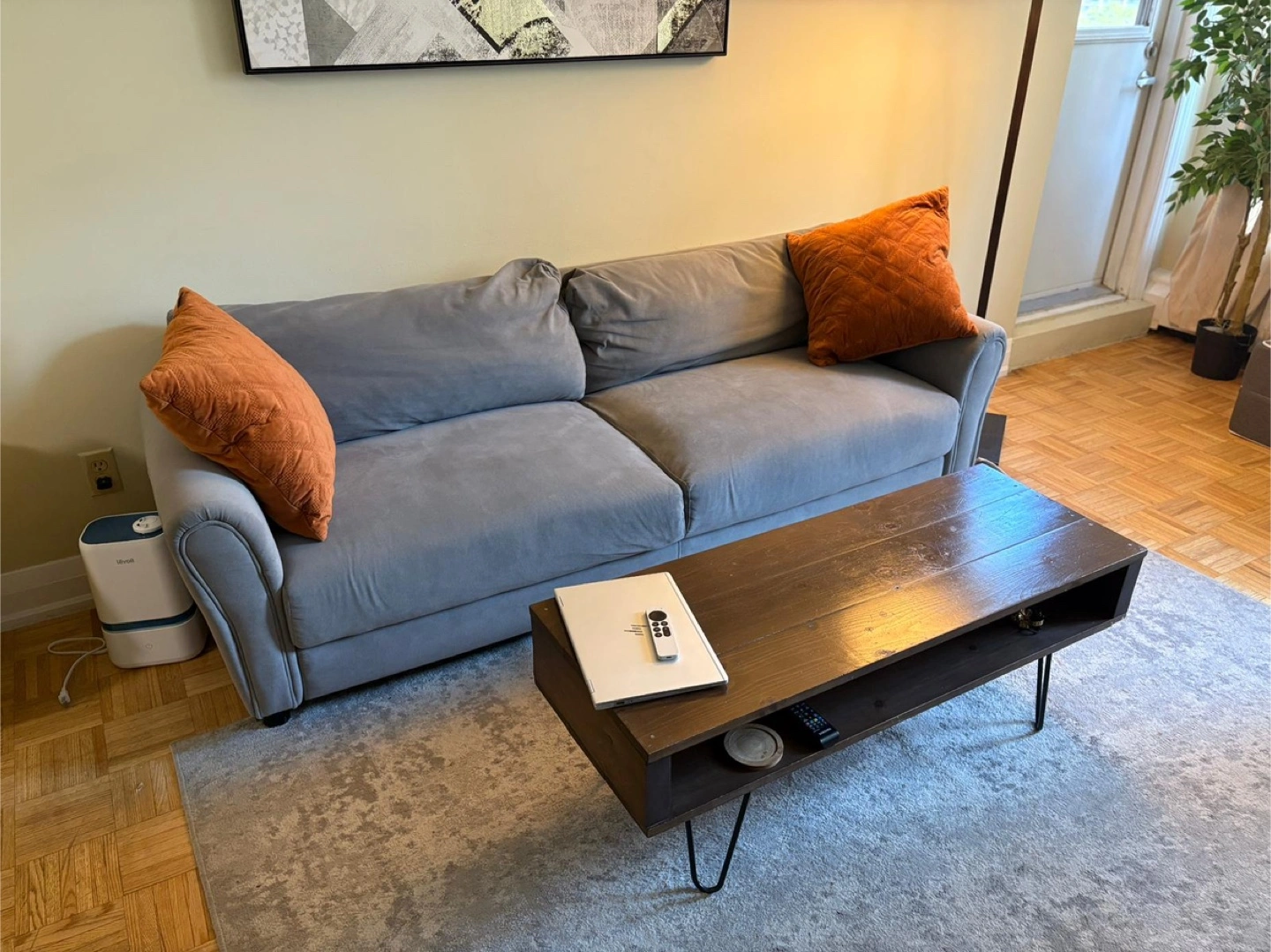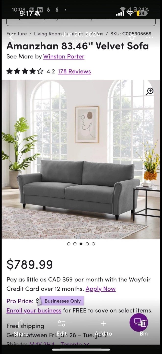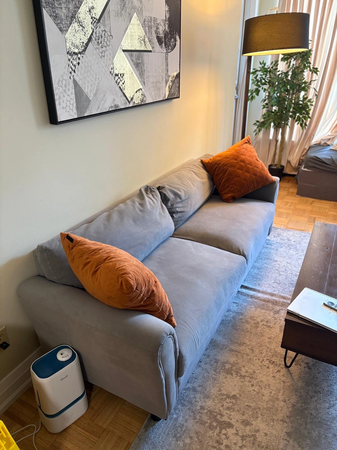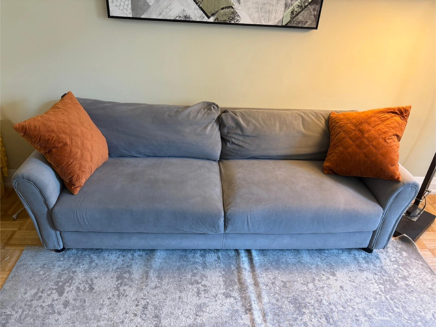 Selling a grey comfy Amanzhan velvet sofa in good condition. The couch is available to inspect at 30 Charles St west. It's a stylish addition to any living room. Originally bought from wayfair . It is listed at 600$+tax