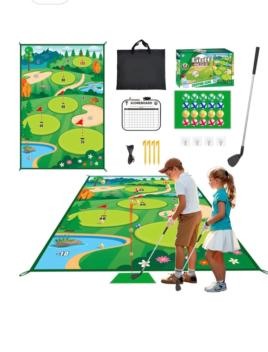 Looking for a fun addition to your next event? Rent this complete golf game set! It's a fantastic way to entertain both kids and adults. The set includes a colourful golf mat with various target zones, a golf club, multiple golf balls, a tee, a score card and a small mat to hit from. Great for birthday parties