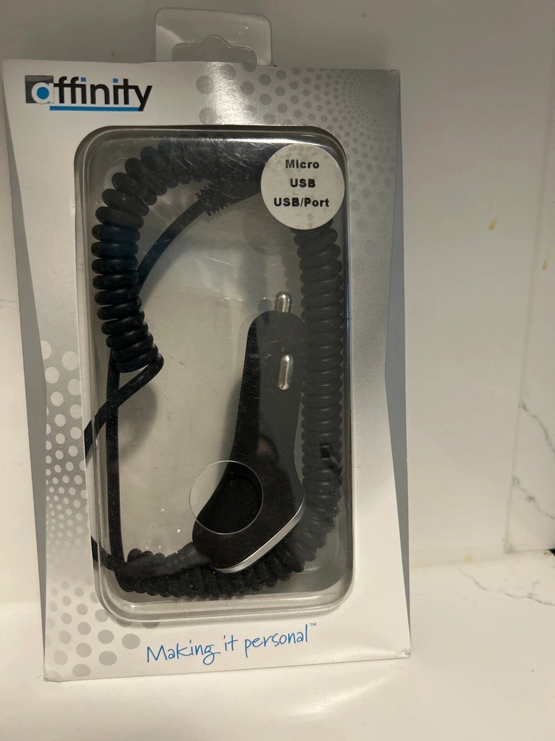 Selling a brand new Affinity car charger! It features a micro USB port and comes in its original packaging. Never been used!