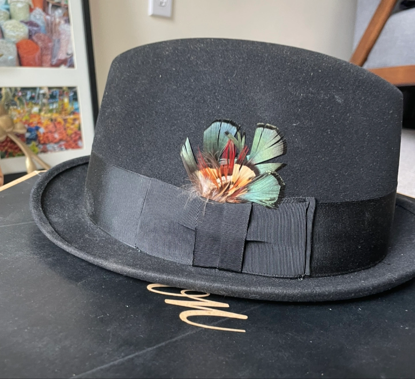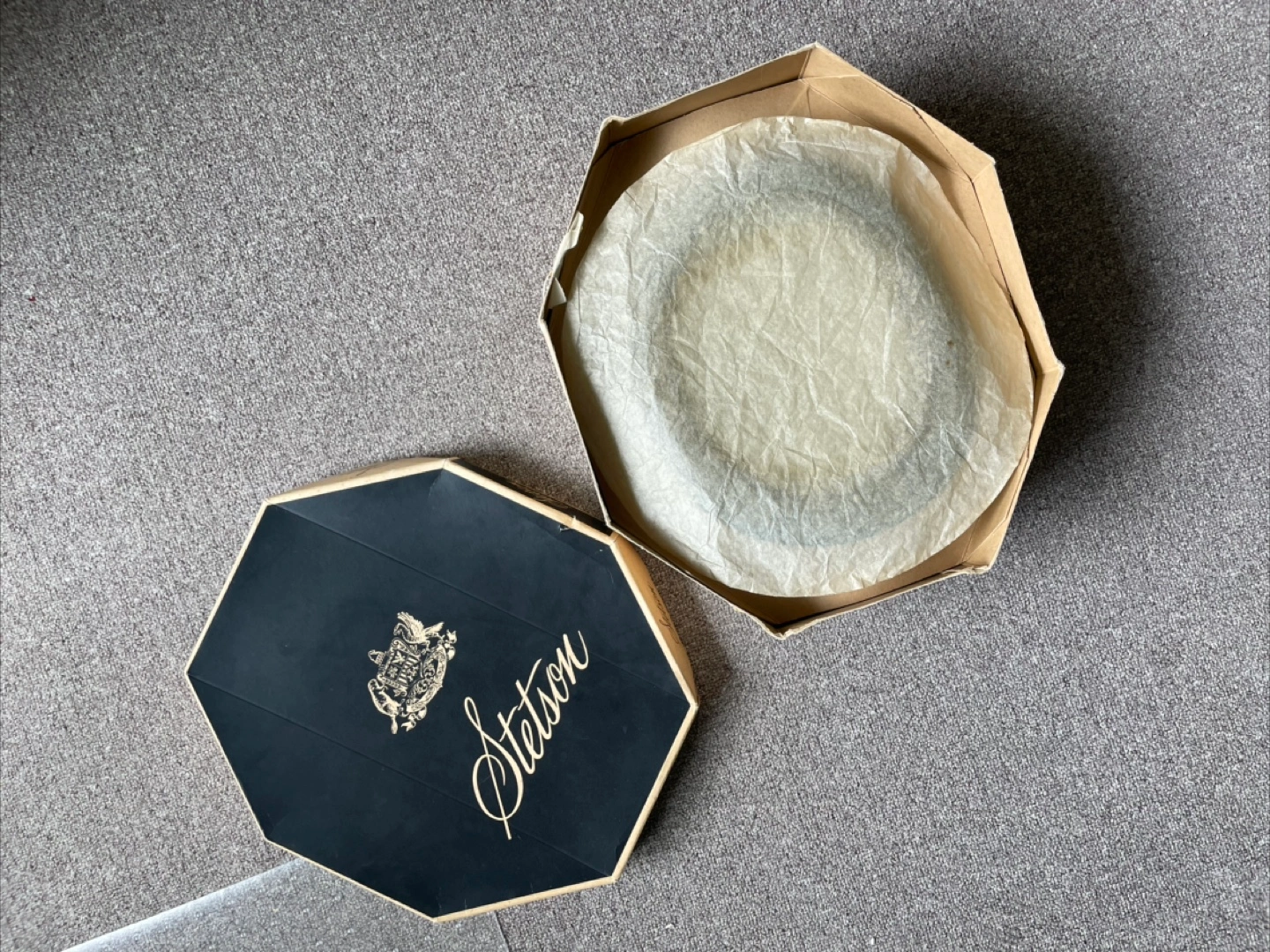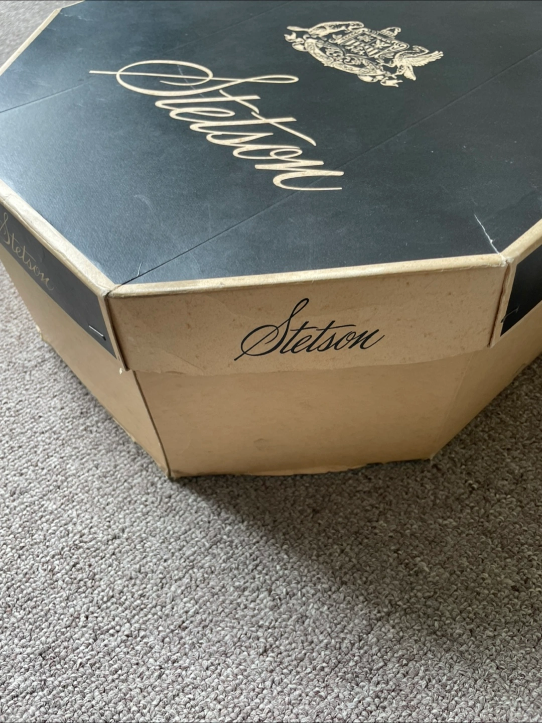 Selling a stylish Stetson hat box with custom Knox Hat in black. It's a size 7 3/8!