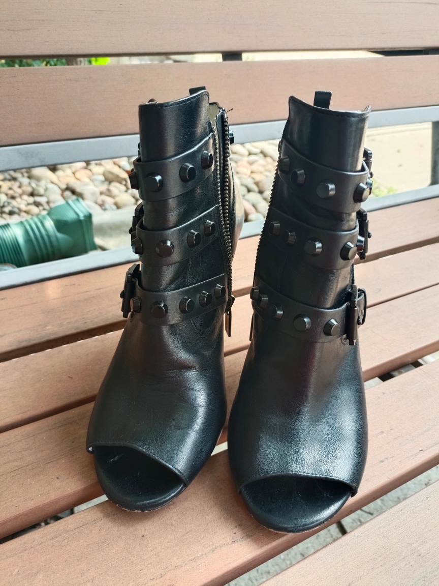 -These black leather ankle boots feature an open-toe design and a stylish stiletto heel. They have a unique look with buckle straps and studded detailing. Perfect for adding an edgy touch to your outfit!