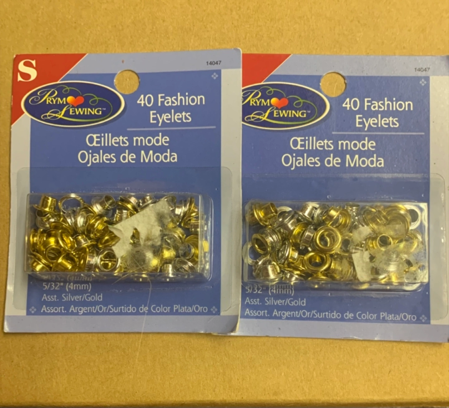 Selling two packs of PRYM Sewing 40 Fashion Eyelets. They're assorted silver and gold and measure 5/32" (4mm). Great for scrapbooking and card making!