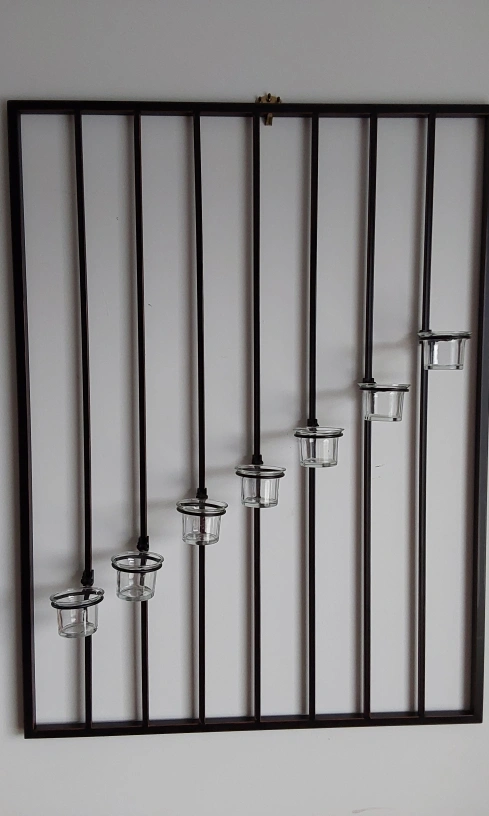 Here's a stylish wall-mounted candle holder! It features a dark iron frame with clear glass cups for candles. It's perfect for adding a touch of warmth and ambiance to any room in your home. not too heavy and purchased at Hudson Bay Dept