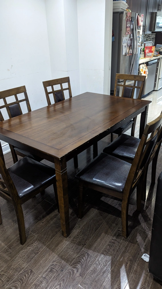 Selling a dining table with five chairs. The set features a dark wood finish and faux leather seats. It's perfect for a kitchen or dining room!