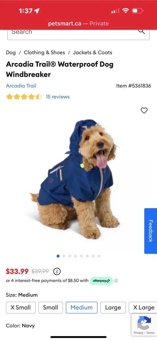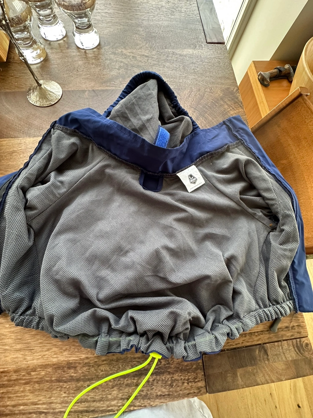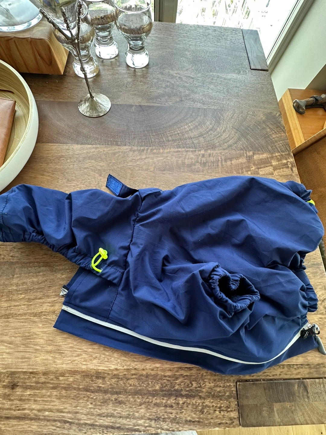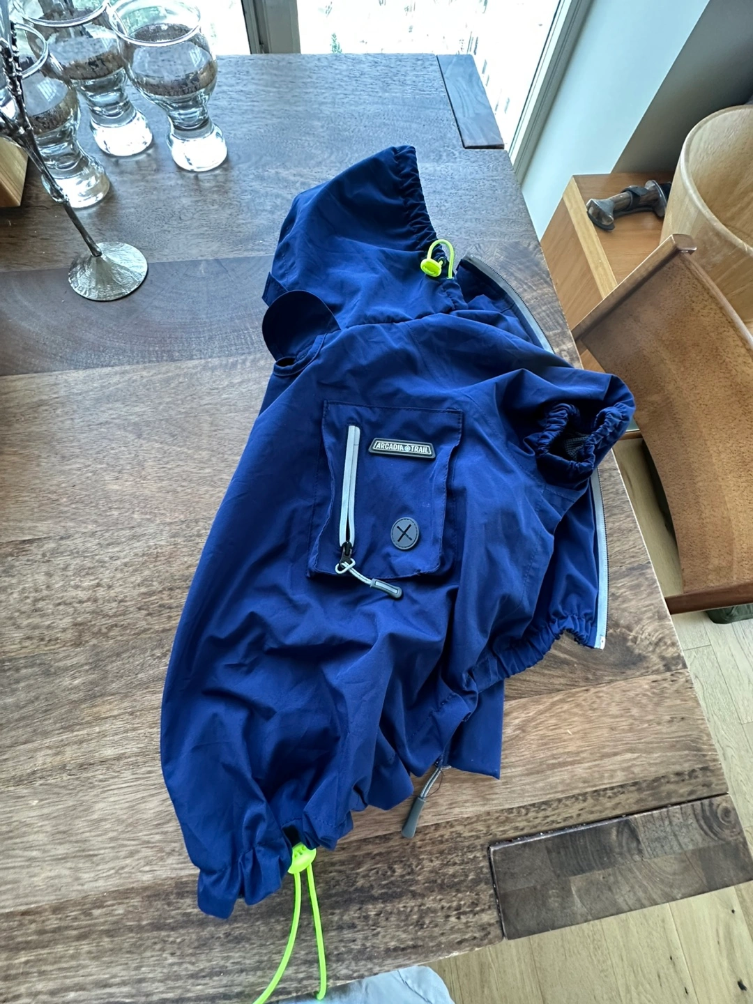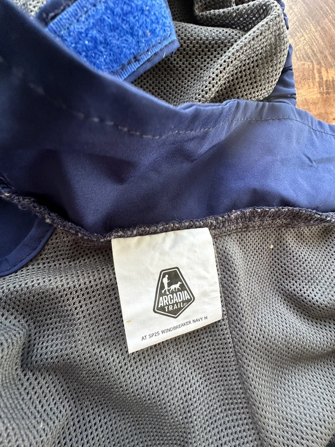 Selling a gently used Arcadia Trail dog windbreaker in size medium. It's a waterproof jacket in navy blue, perfect for keeping your furry friend dry on walks.