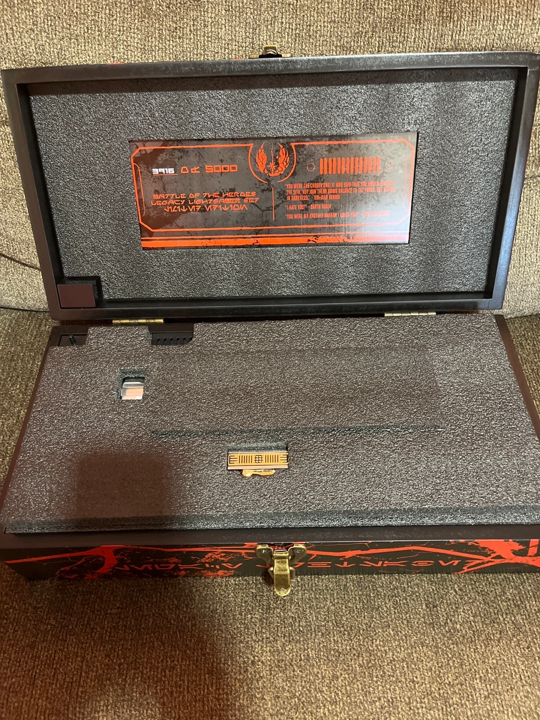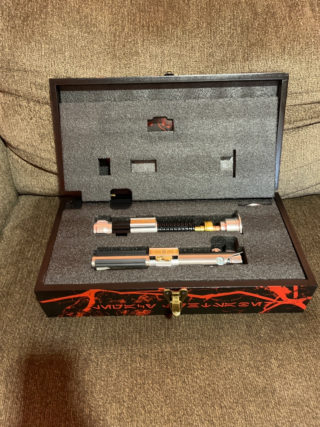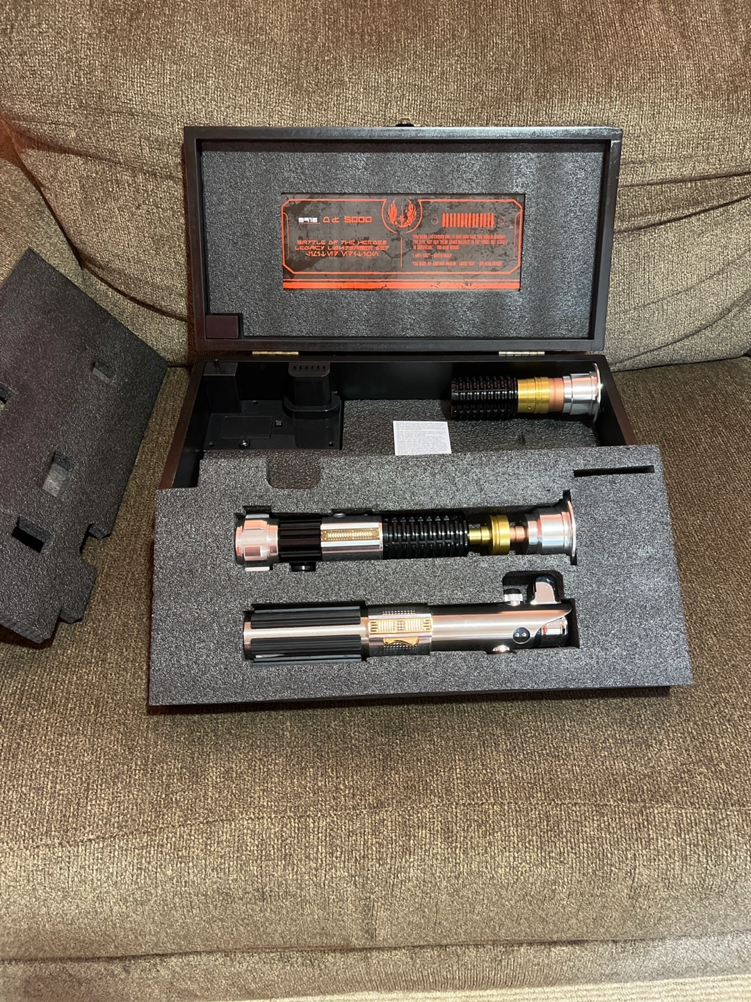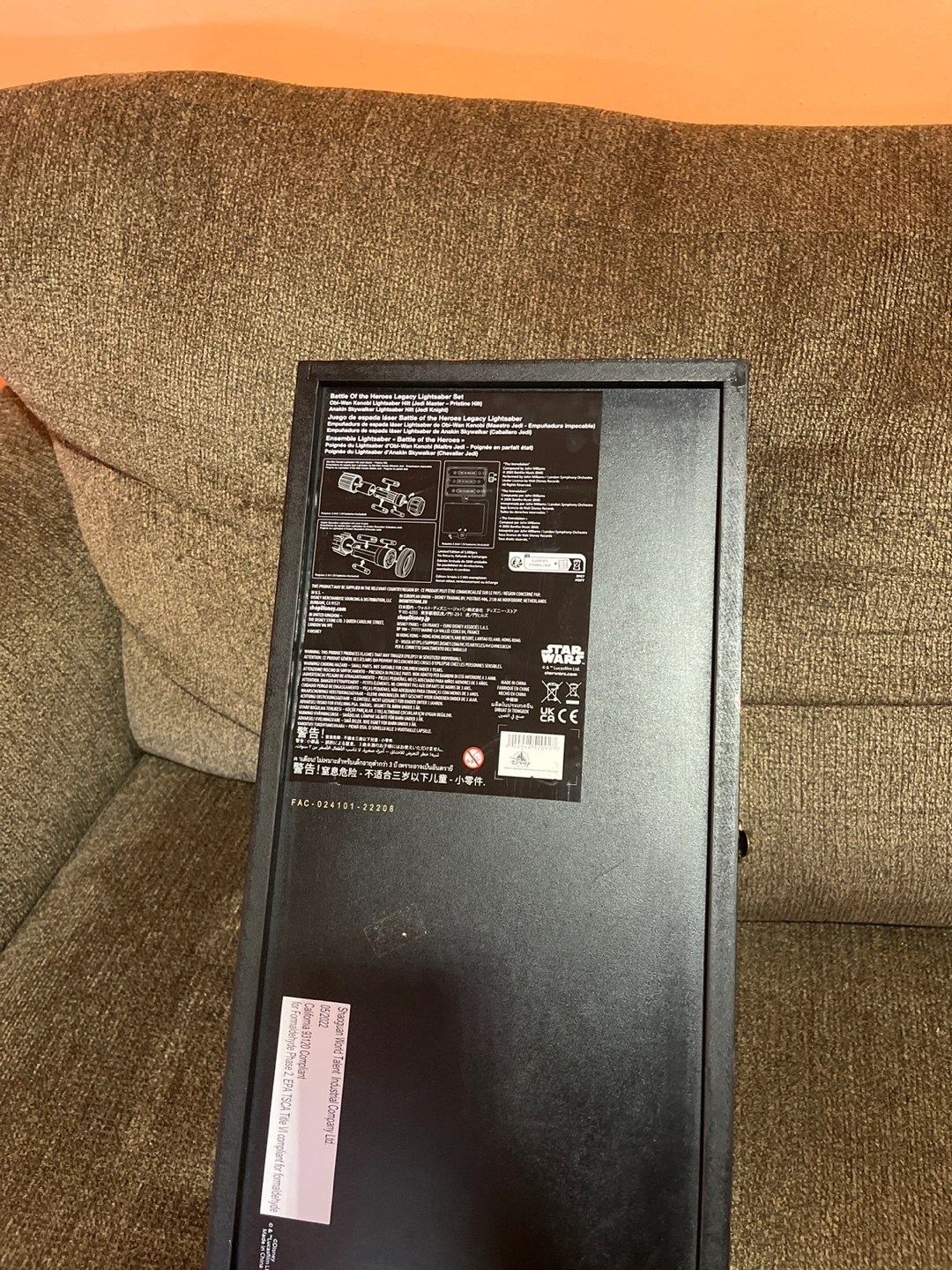 Selling a Star Wars Legacy Lightsaber Set. The set comes in its original box with all components included. The box has a cool design with red and black patterns. It's a great item for any Star Wars fan! Also has music.
