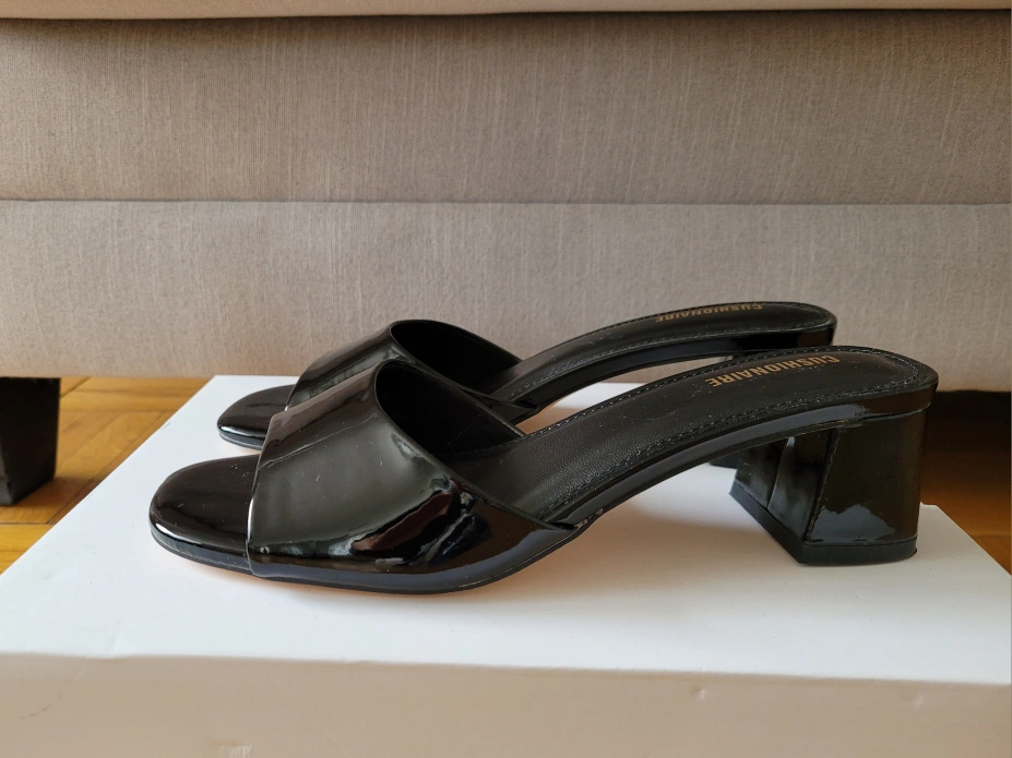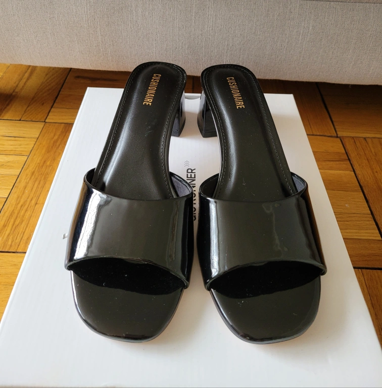 281Only used a few times 6 cm heels Pair of black patent leather mules. Low block heel. Open toe. Simple design. Cushionaire brand.