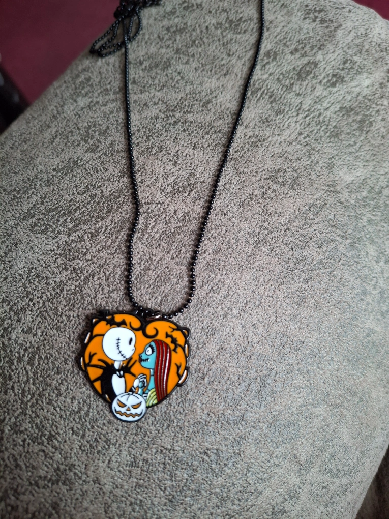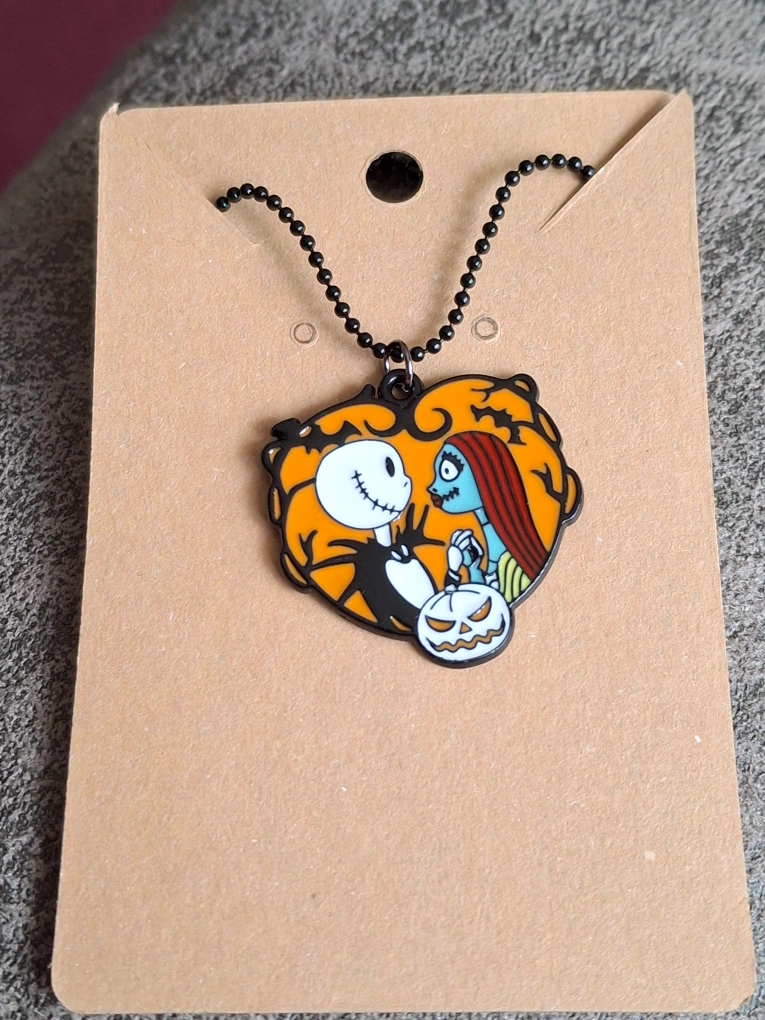 A lovely necklace featuring Jack and Sally from The Nightmare Before Christmas! It has a black chain and a colourful pendant with Jack, Sally, and a pumpkin.