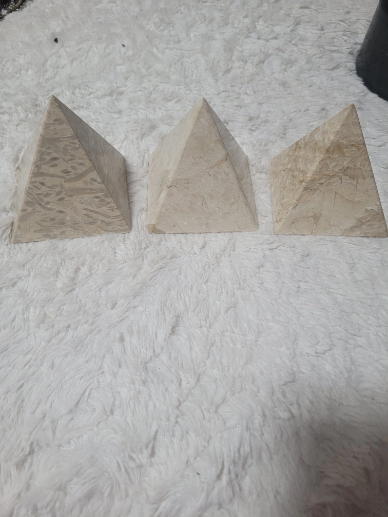 Selling a stone pyramid, perfect for home decor or as a paperweight. It has a unique pattern and a smooth finish. Could add a touch of zen to your space!