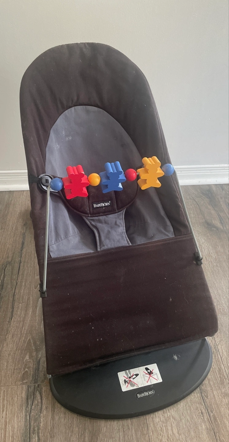 Selling a BabyBjörn Bouncer Balance Soft in black! It can benefit from a cover wash from being in storage. This bouncer is perfect for keeping your little one comfortable and entertained. The removable wooden toy bear bar is included!