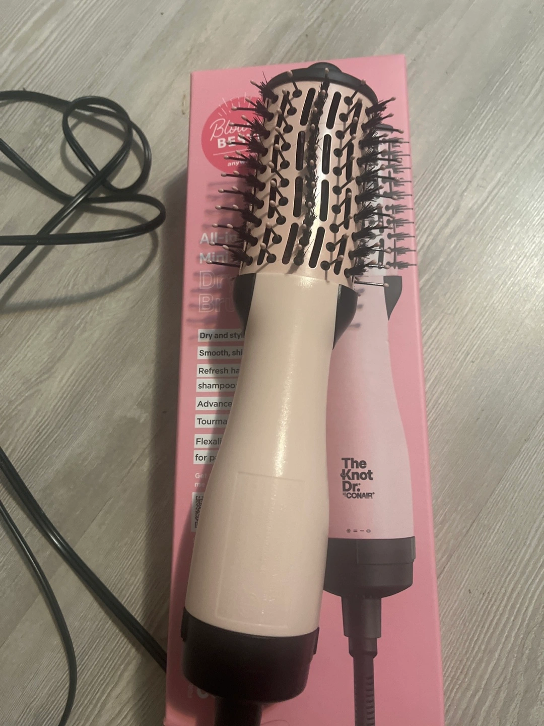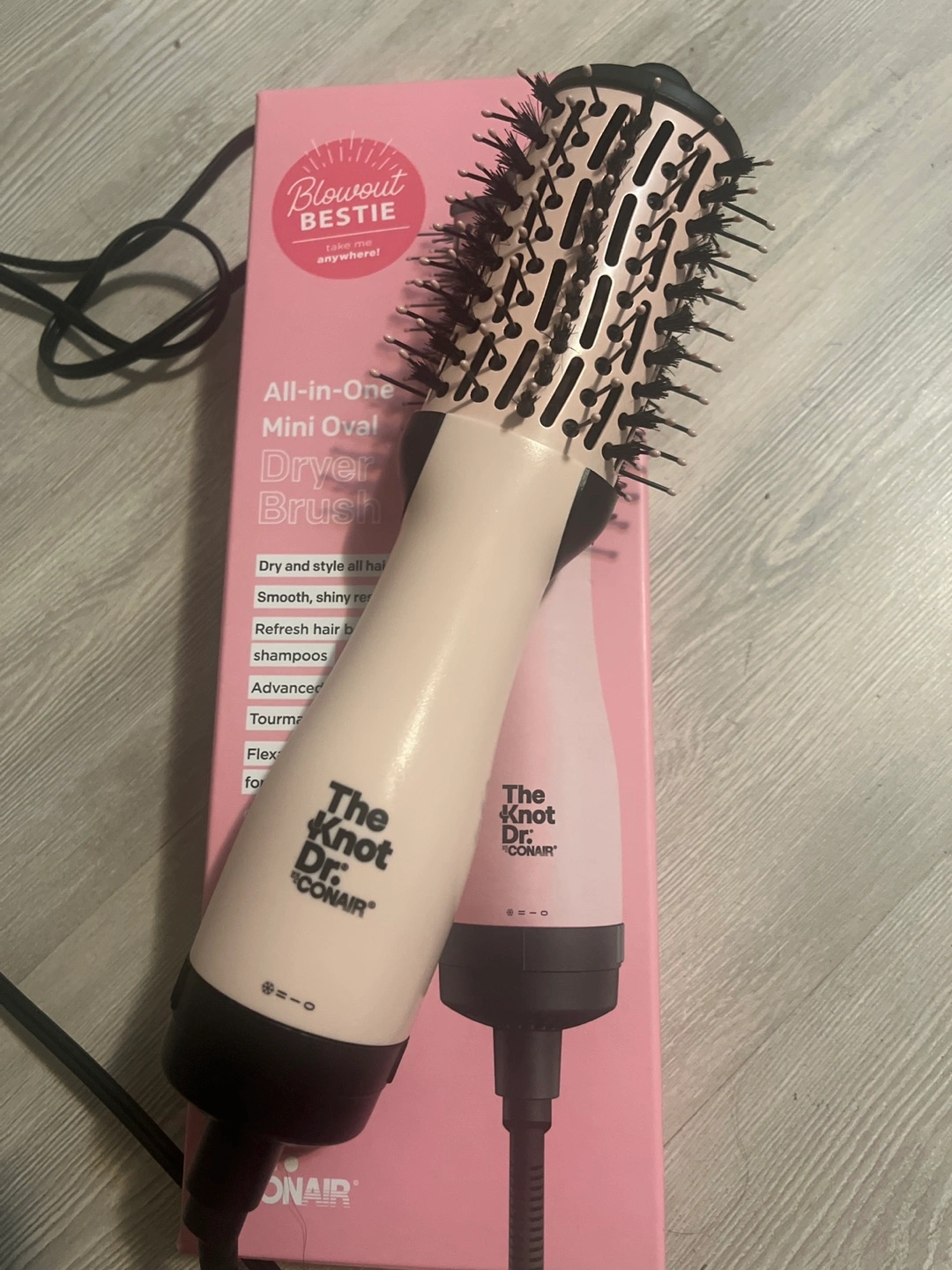 Selling a The Knot Dr. Conair All-in-One Mini Oval Dryer Brush! It's perfect for drying and styling all hair types, leaving you with smooth, shiny results. It can even refresh your hair between shampoos. Key features include advanced ionic conditioning, tourmaline ceramic, and flexalite bristles for painless detangling. The box is included!