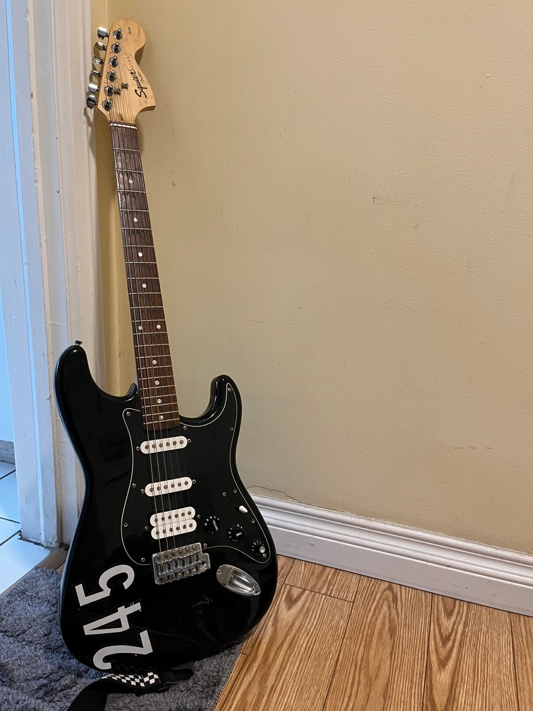 40Fender squier affinity stratocaster Black colour with black stock pickguard HSS pickup configuration Small scuffs as in the pictures No fault in playing Strap included Pick up at broadview avenue Open to offers