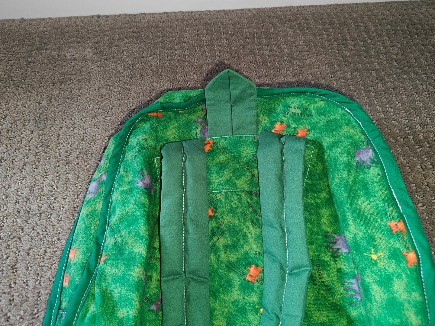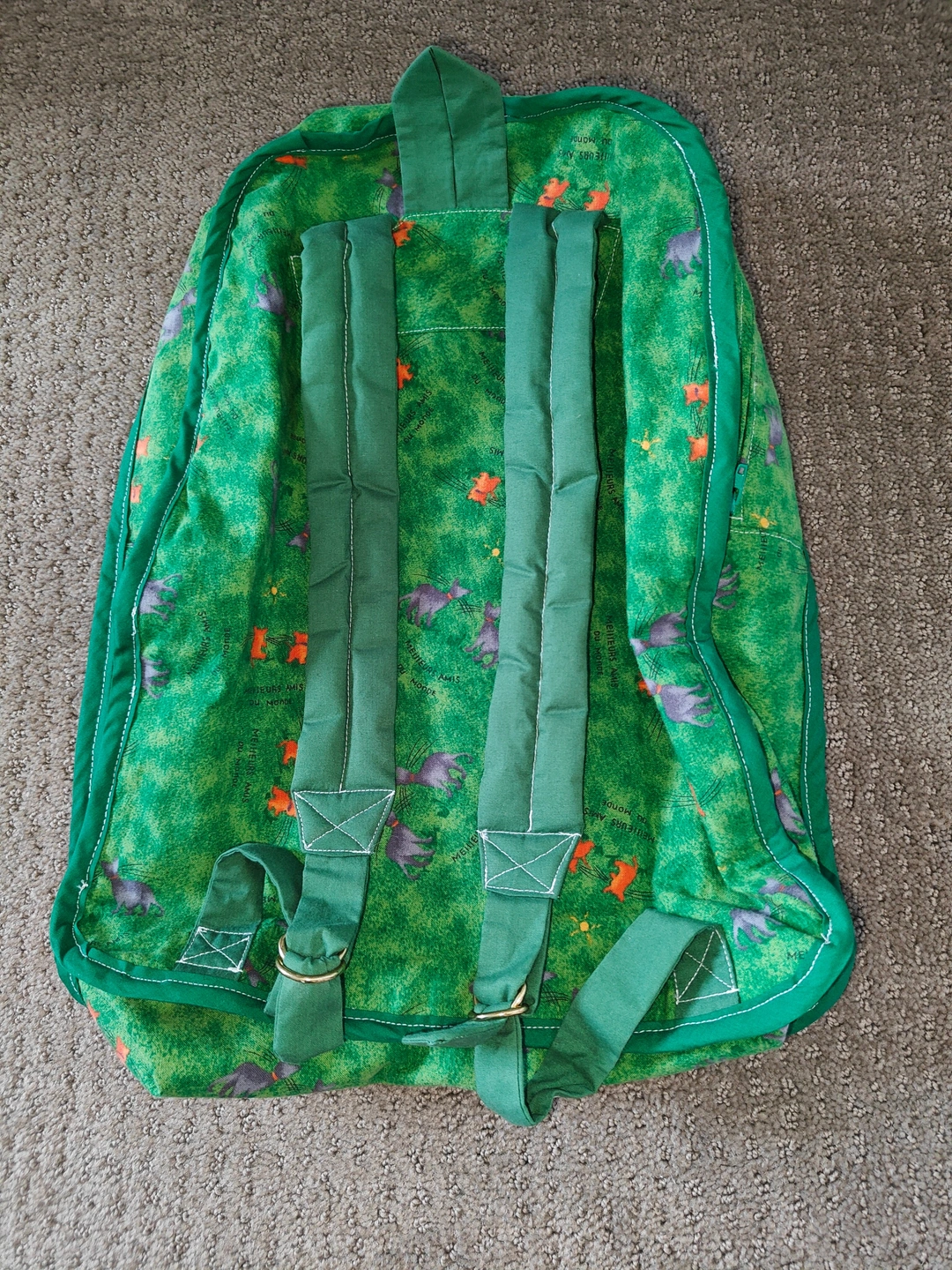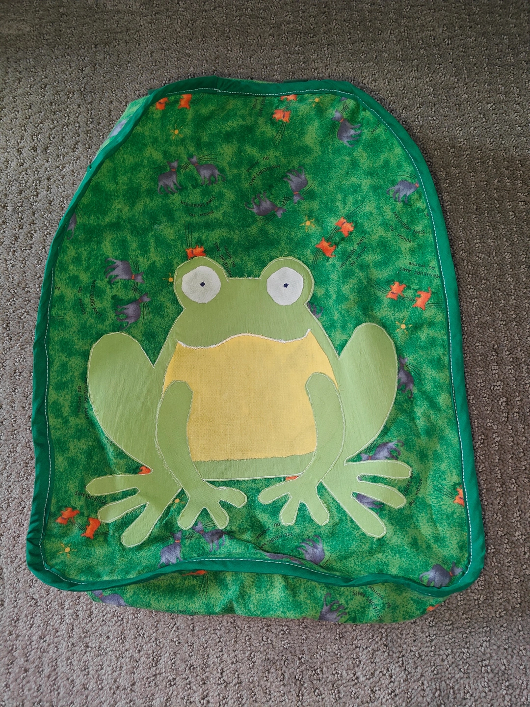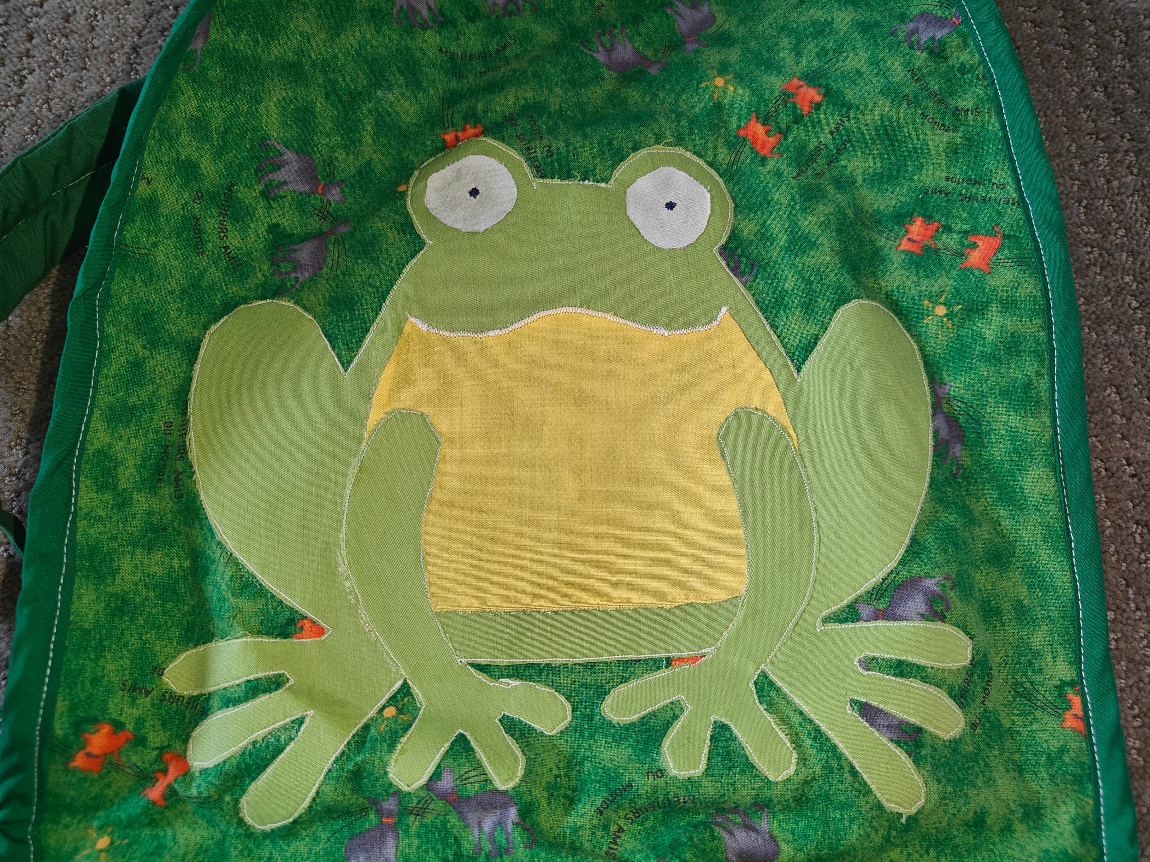 Featuring a charming appliquéd frog design on a vibrant green "grassy" print, complete with tiny grey creatures and orange flowers, this back pack is sure to spark joy and imagination. It's perfectly sized for little adventurers to carry their favorite toys, snacks, or treasures.