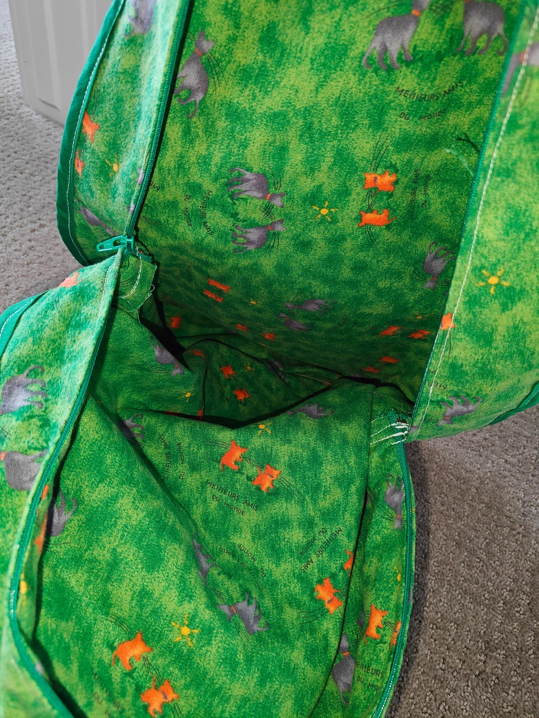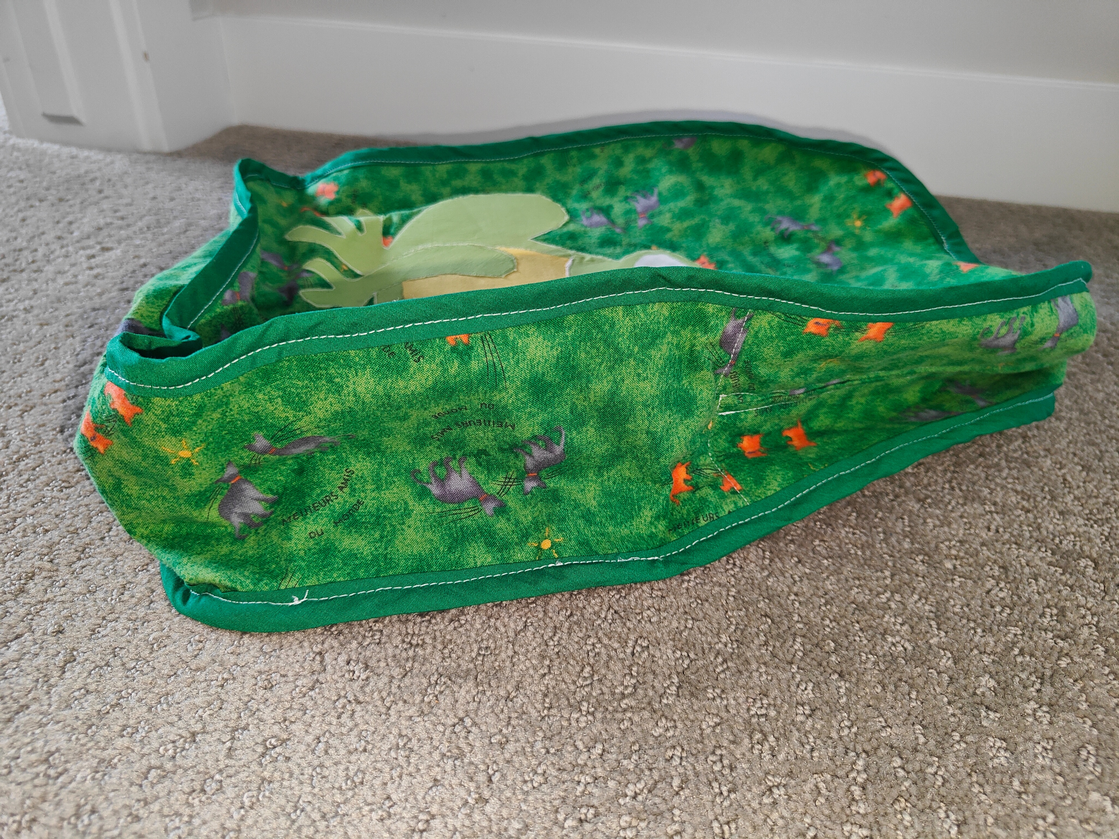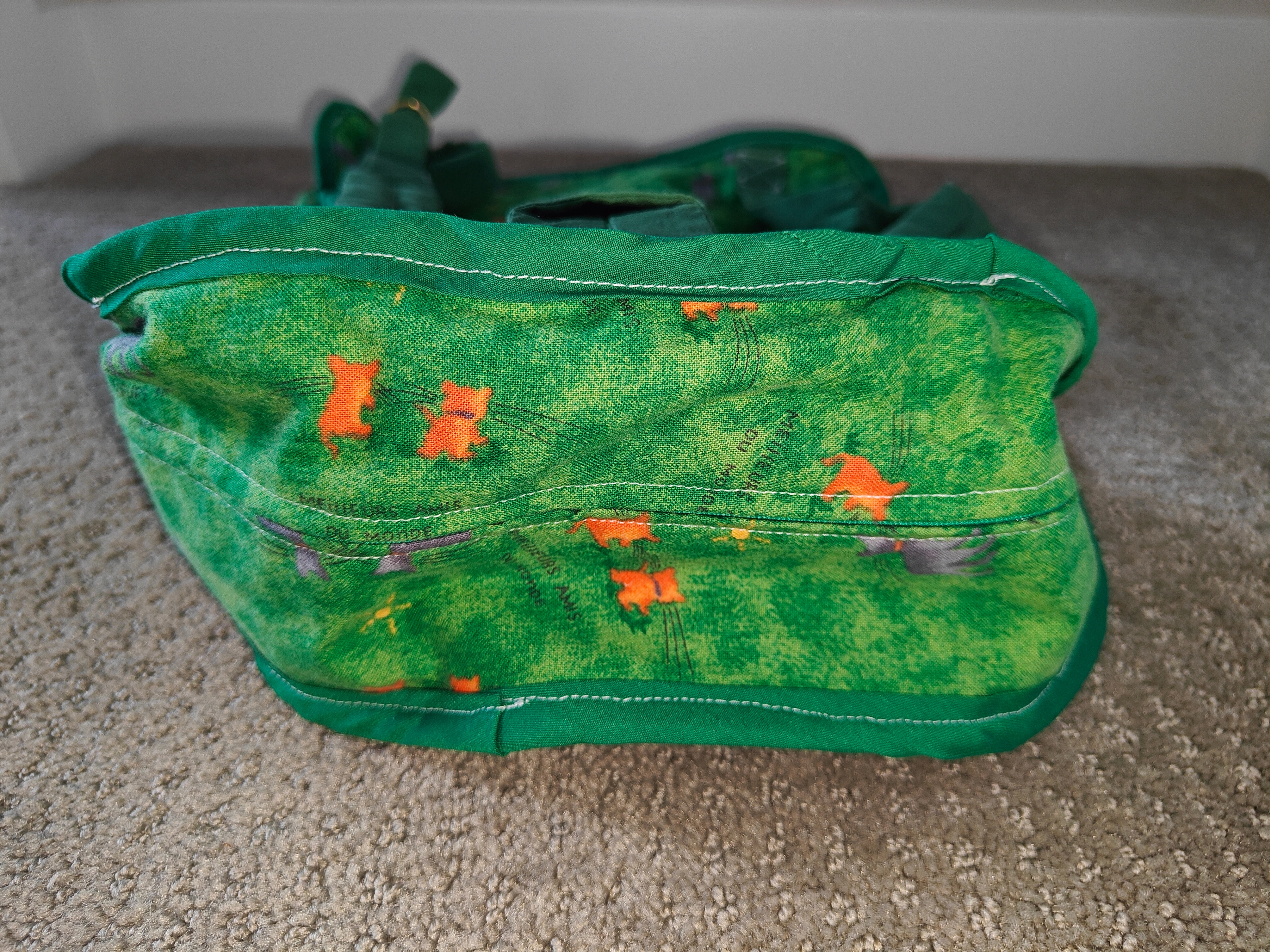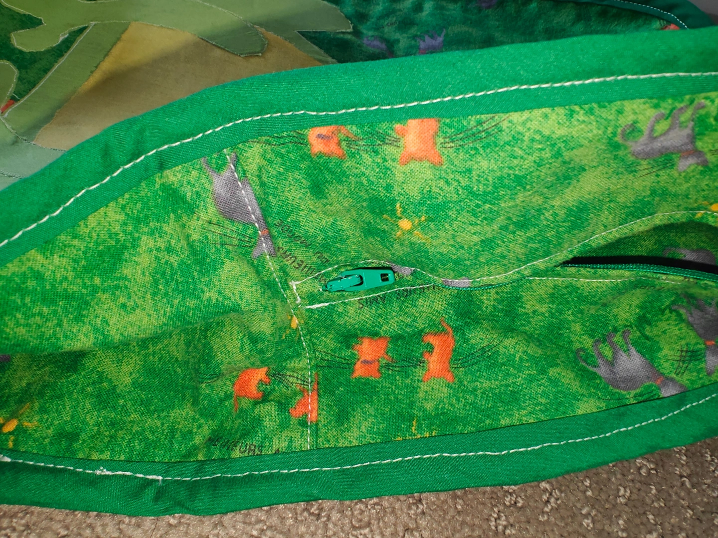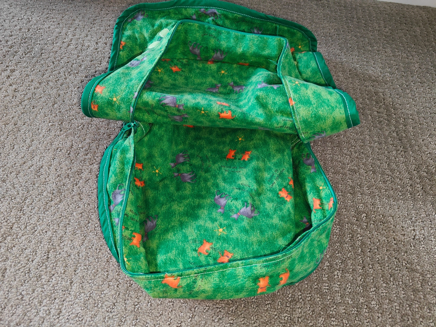 Featuring a charming appliquéd frog design on a vibrant green "grassy" print, complete with tiny grey creatures and orange flowers, this back pack is sure to spark joy and imagination. It's perfectly sized for little adventurers to carry their favorite toys, snacks, or treasures.