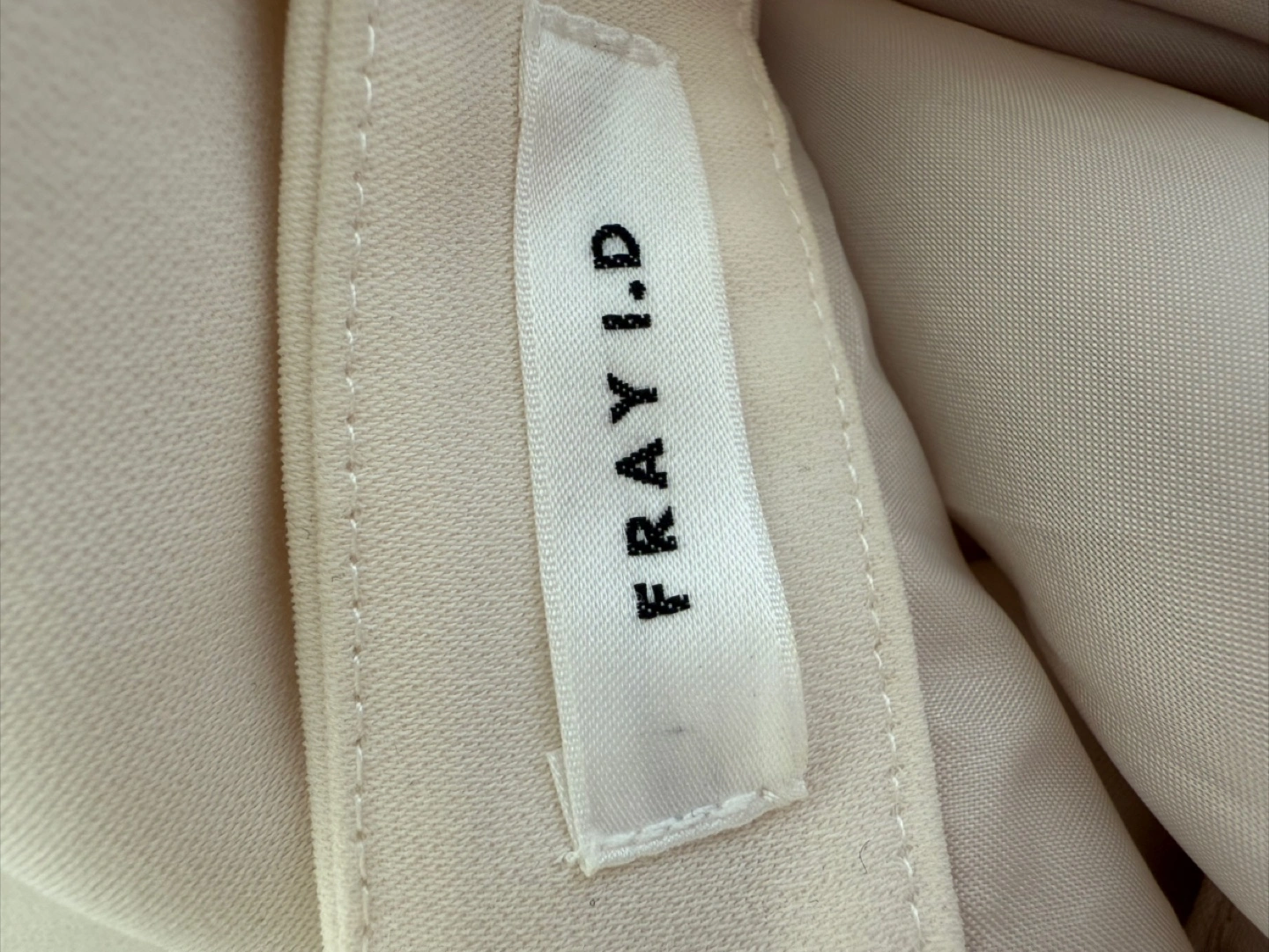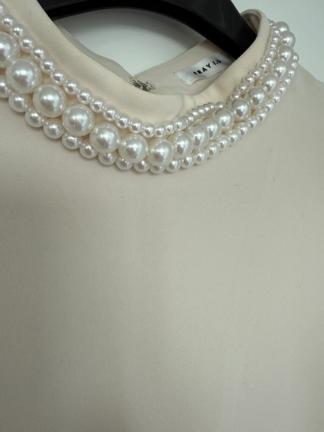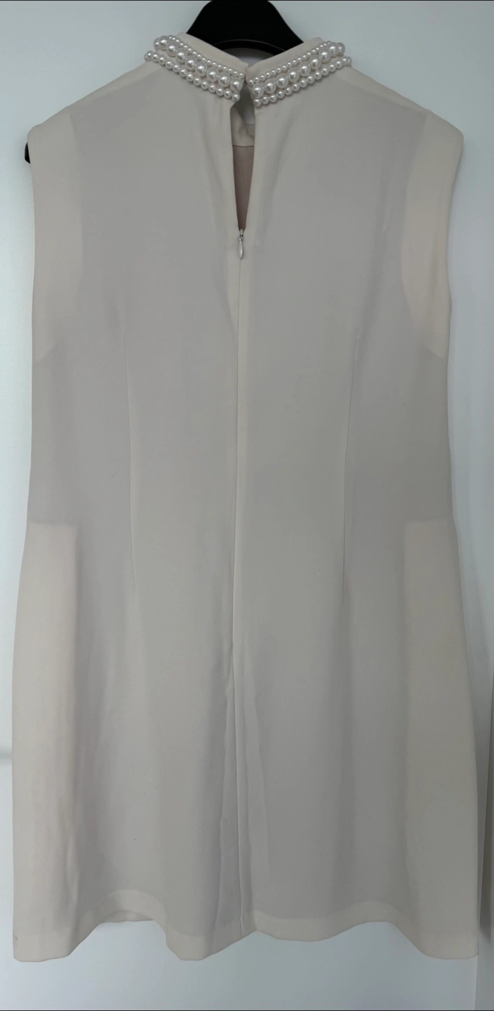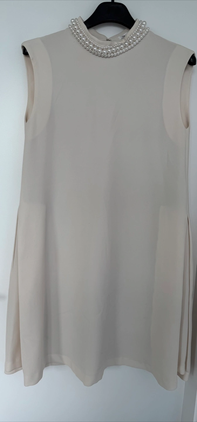 Selling a beautiful dress from FRAY I.D. It features a unique pearl-embellished neckline, adding a touch of elegance to the simple design. The dress is a lovely cream colour and in great condition!