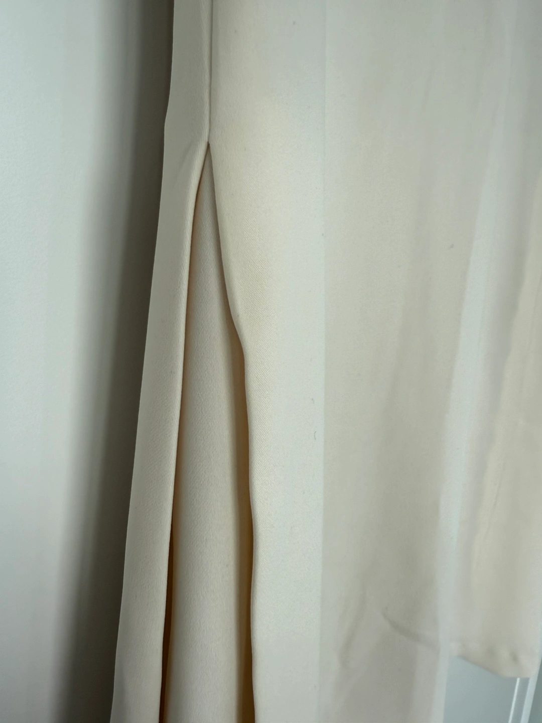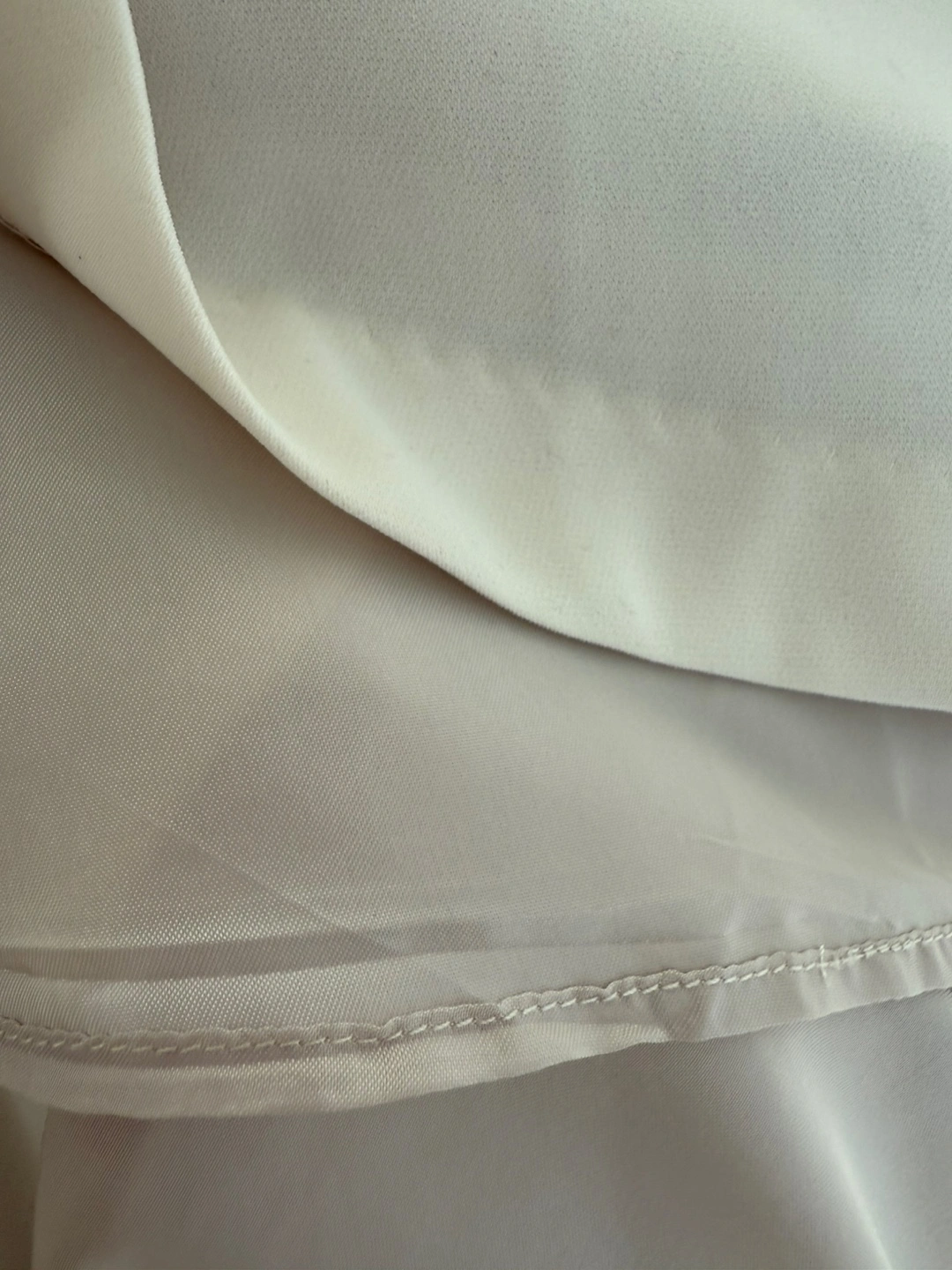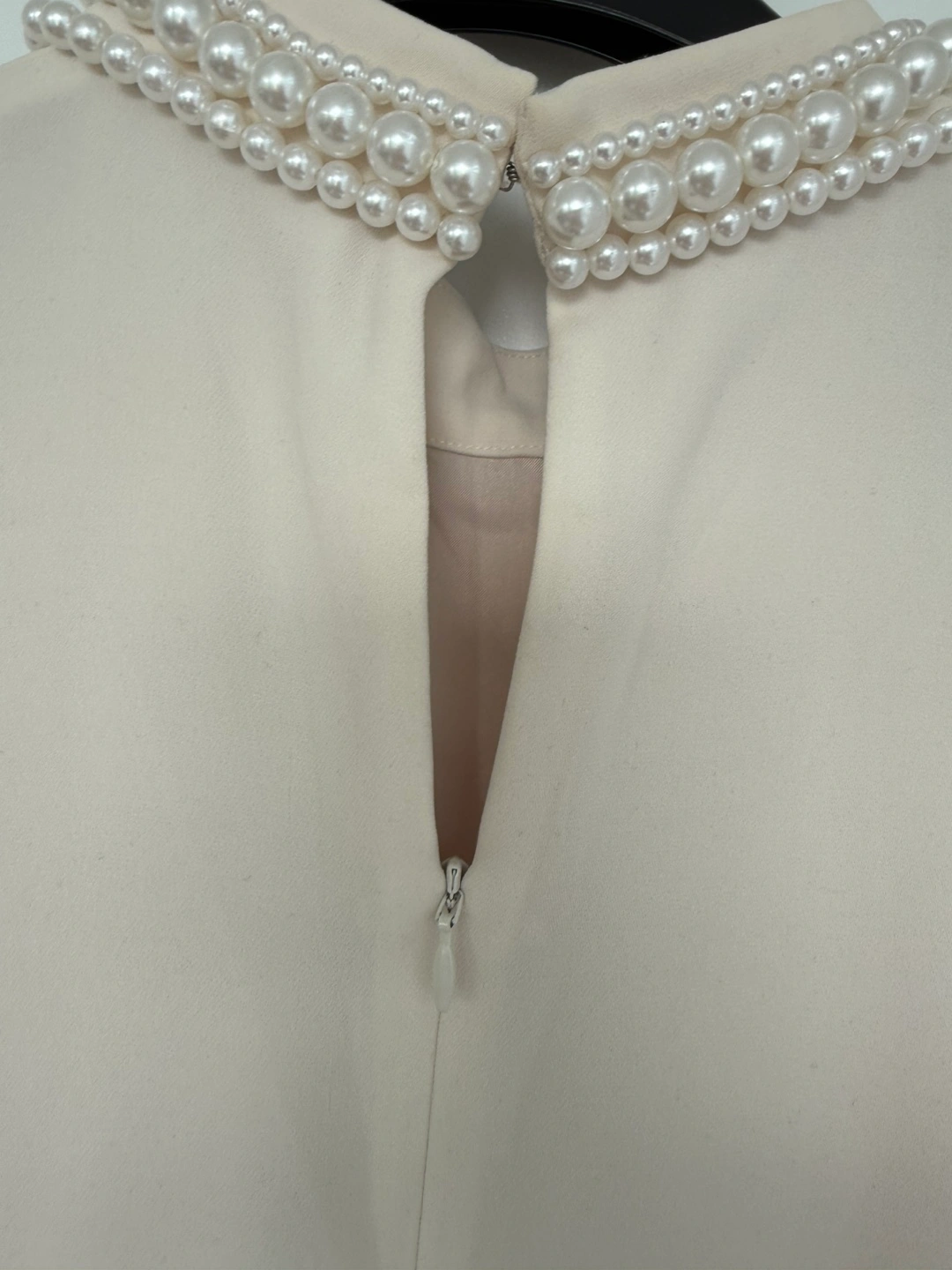 Selling a beautiful dress from FRAY I.D. It features a unique pearl-embellished neckline, adding a touch of elegance to the simple design. The dress is a lovely cream colour and in great condition!