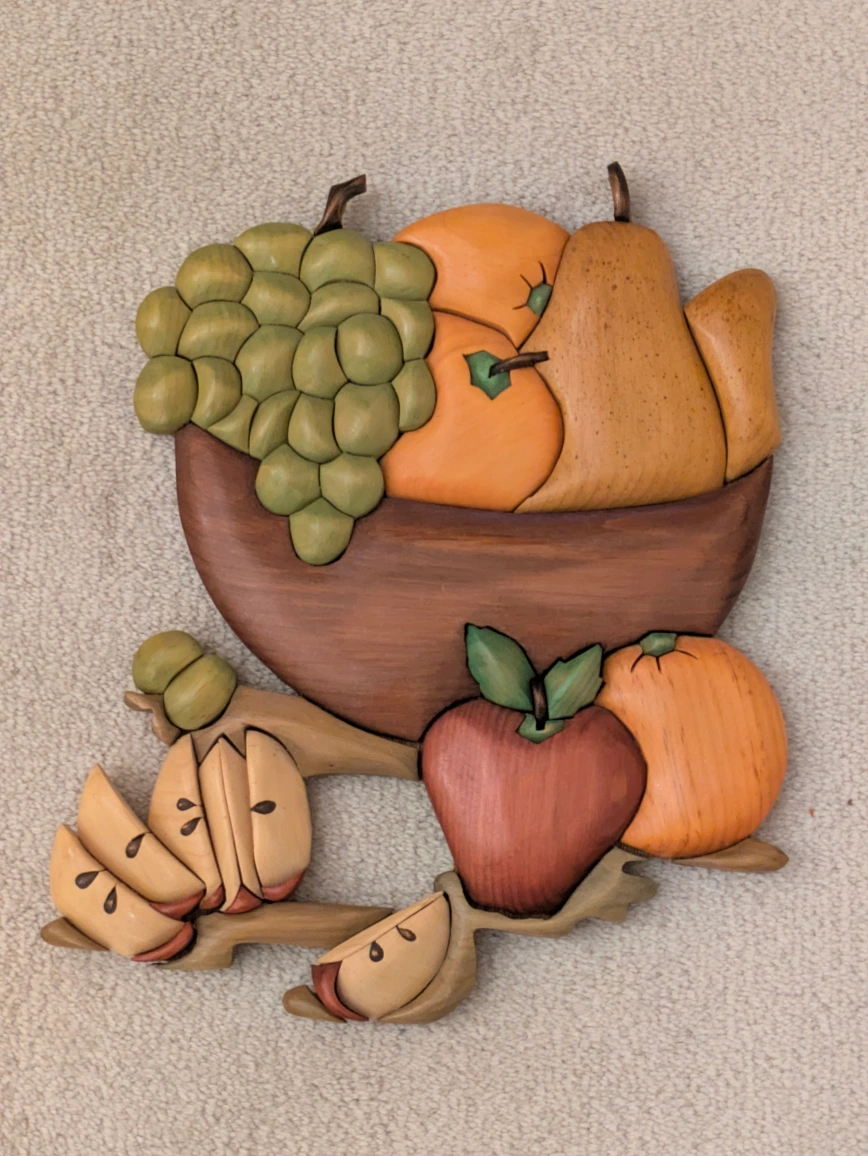 This is a handcrafted wooden fruit bowl wall hanging made by R & J Woodcrafts. It's a charming piece that would add a touch of warmth to any room. It's in great condition and ready to find a new home! 32cm x 38cm Available for pick up in front of food basics (intersection of Major Mackenzie and Bayview)