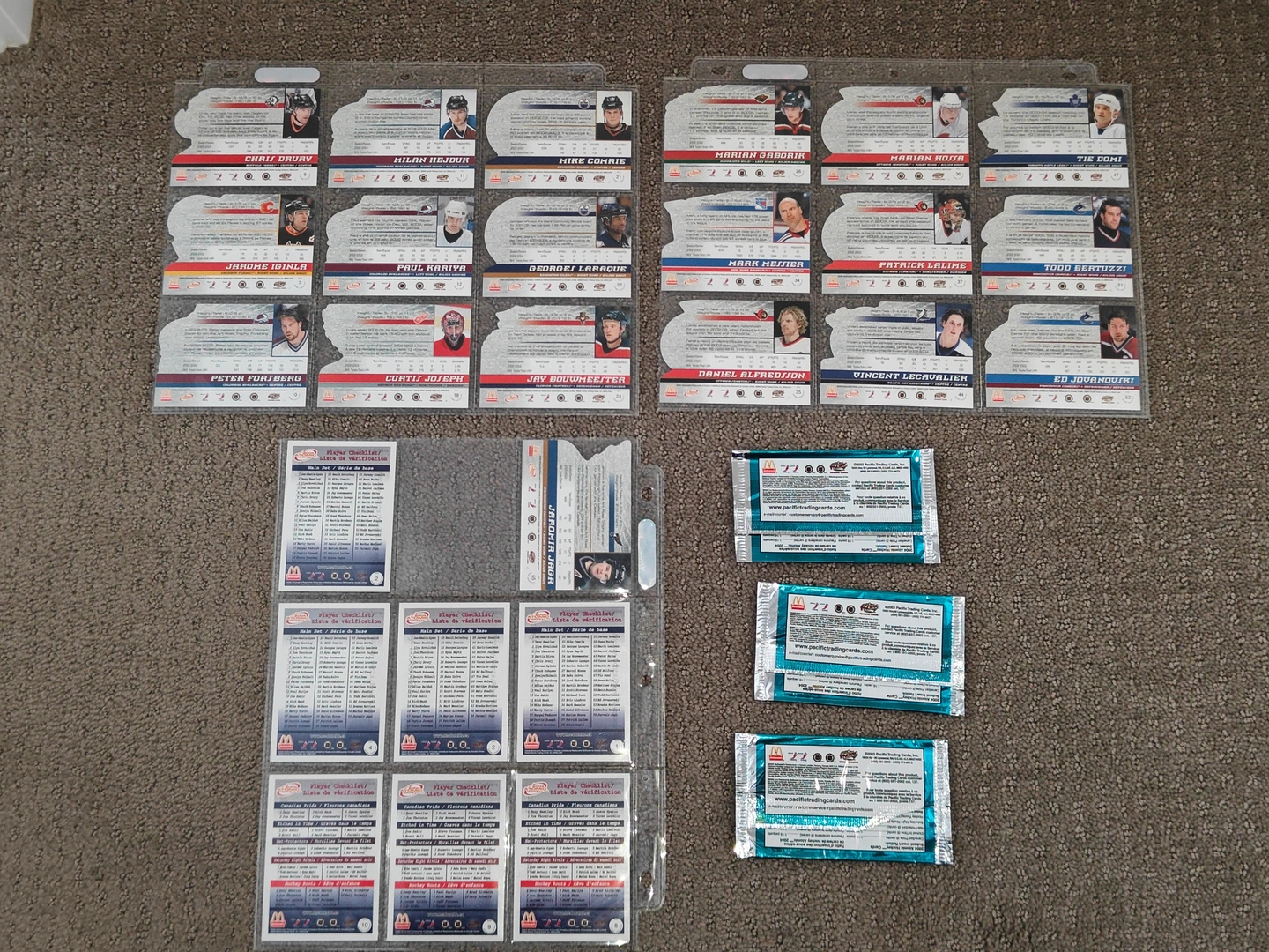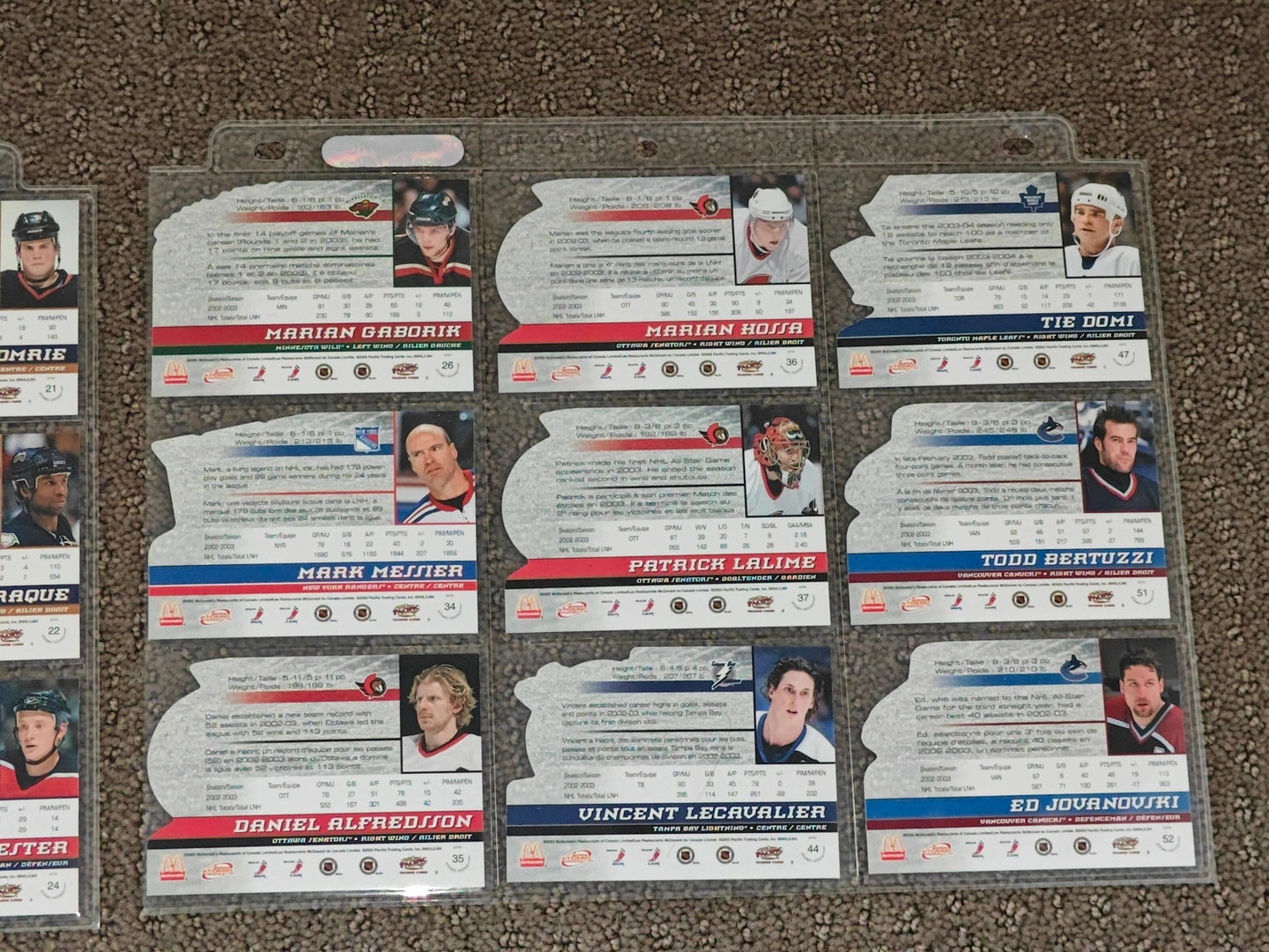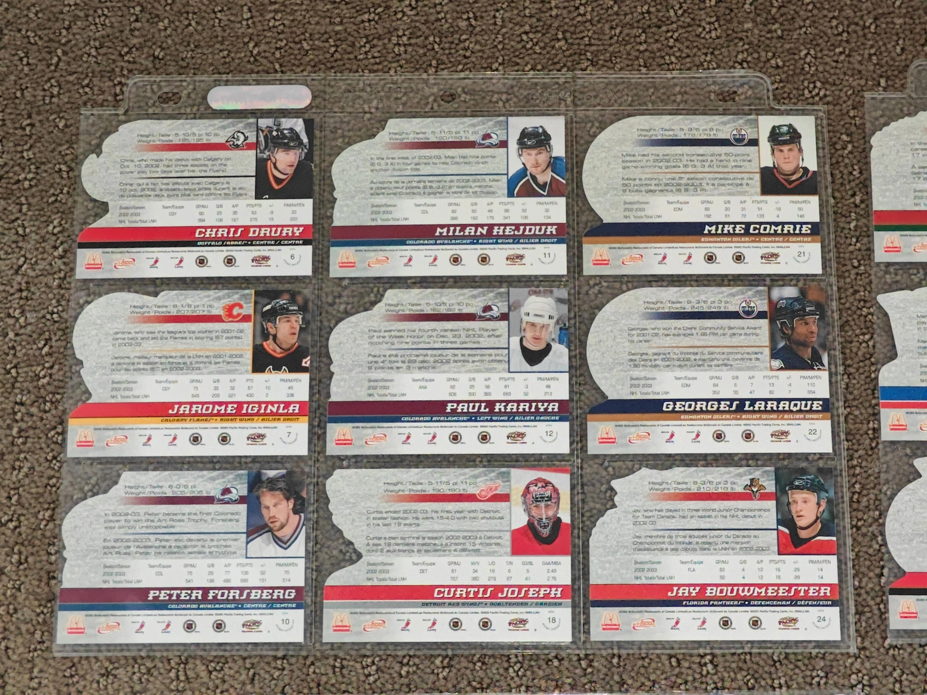 174NOTE: 2003-04 McDonalds Pacific Atomic Hockey Trading Card Set is NOT a Complete Set, please see list of cards included I am selling a partial 2003-04 McDonald's Pacific Atomic Hockey Trading Cards in excellent condition. Includes: * 26 Card Count * 3 Ultra ProTrading Card Sleeves * 3 Opened Empty Foil Packs * 6 - Drury * 7 - Iginla * 10 - Forsberg * 11 - Hejouk * 12 - Kariya * 18 - Joseph * 21 - Comrie * 22 - Laraque * 24 - Bouwmeester * 26 - Gaborik * 34 - Messier * 35 - Alfredsson * 36 - Hossa * 37 - Lalime * 44 - Lecavalier * 47 - Domi * 51 - Bertuzzi * 52 - Jovanovski * 55 - Jagr Hockey Roots Checklist cards: * 1 - Heatley * 2 - Thornton (2 Cards) * 4 - Blake * 8 - LeCavalier * 9 - Richards * 10 - Roberts Comes from a pet and smoke-free environment. Pickup in Mount Pleasant (NW Calgary)