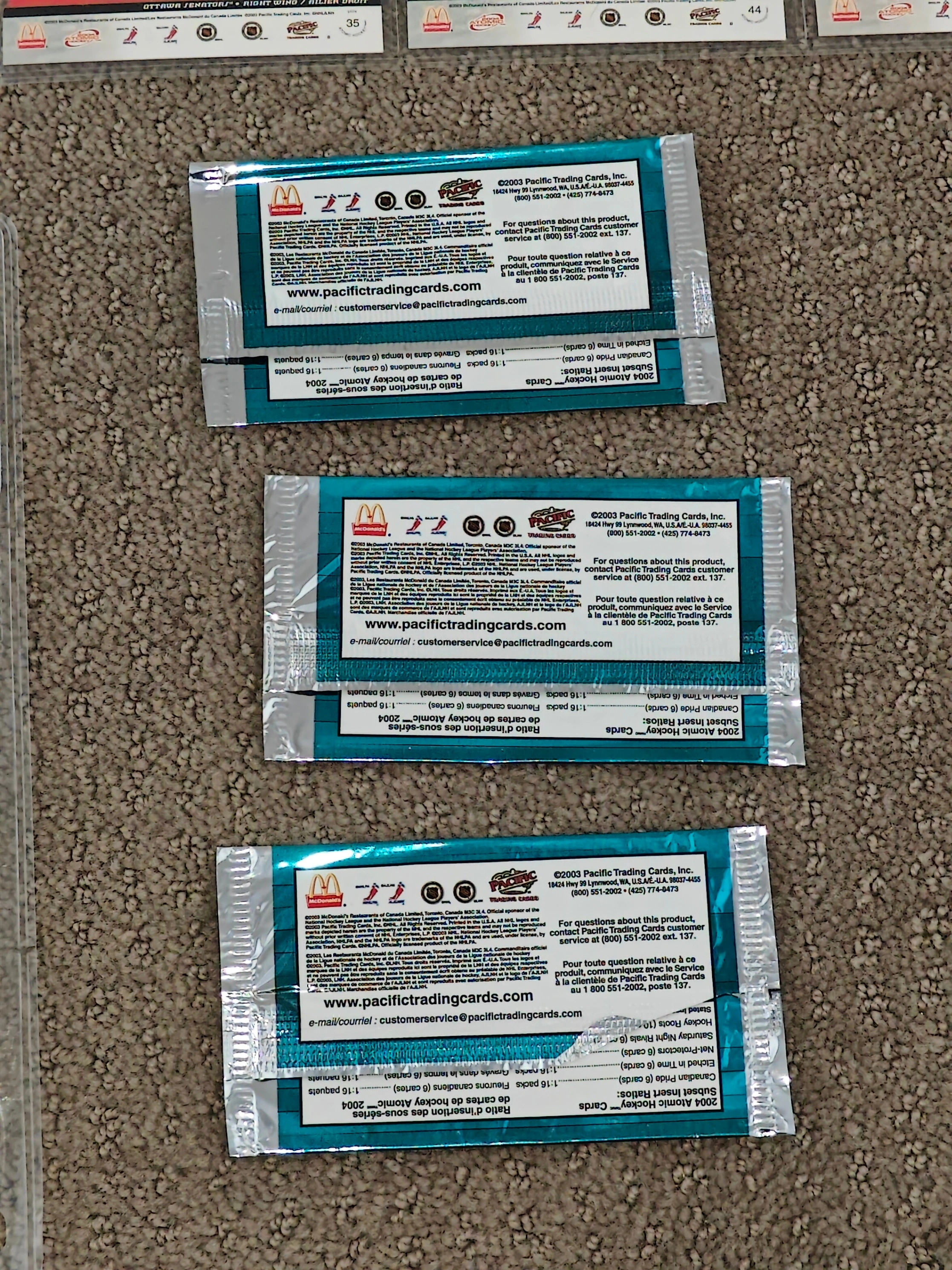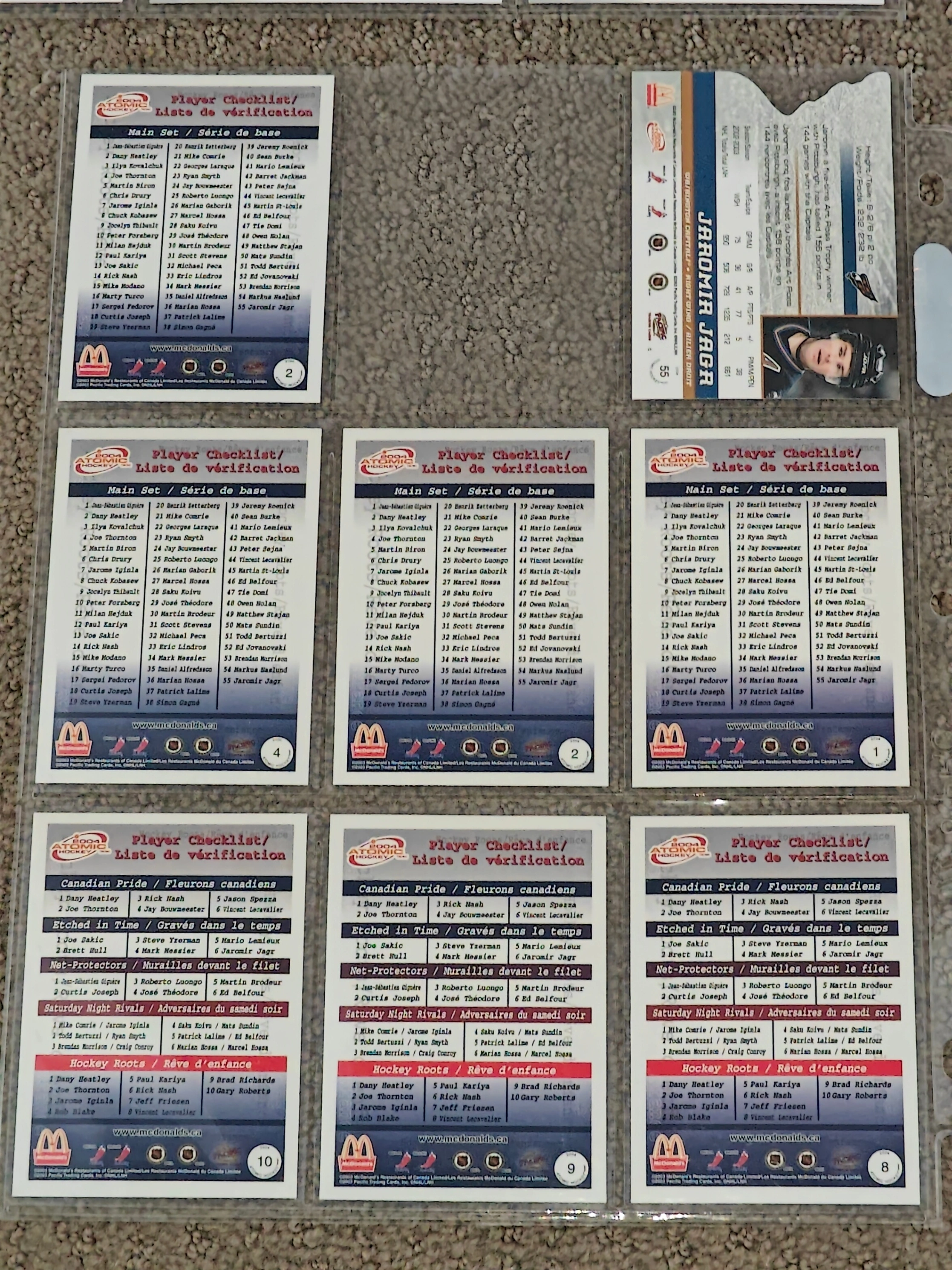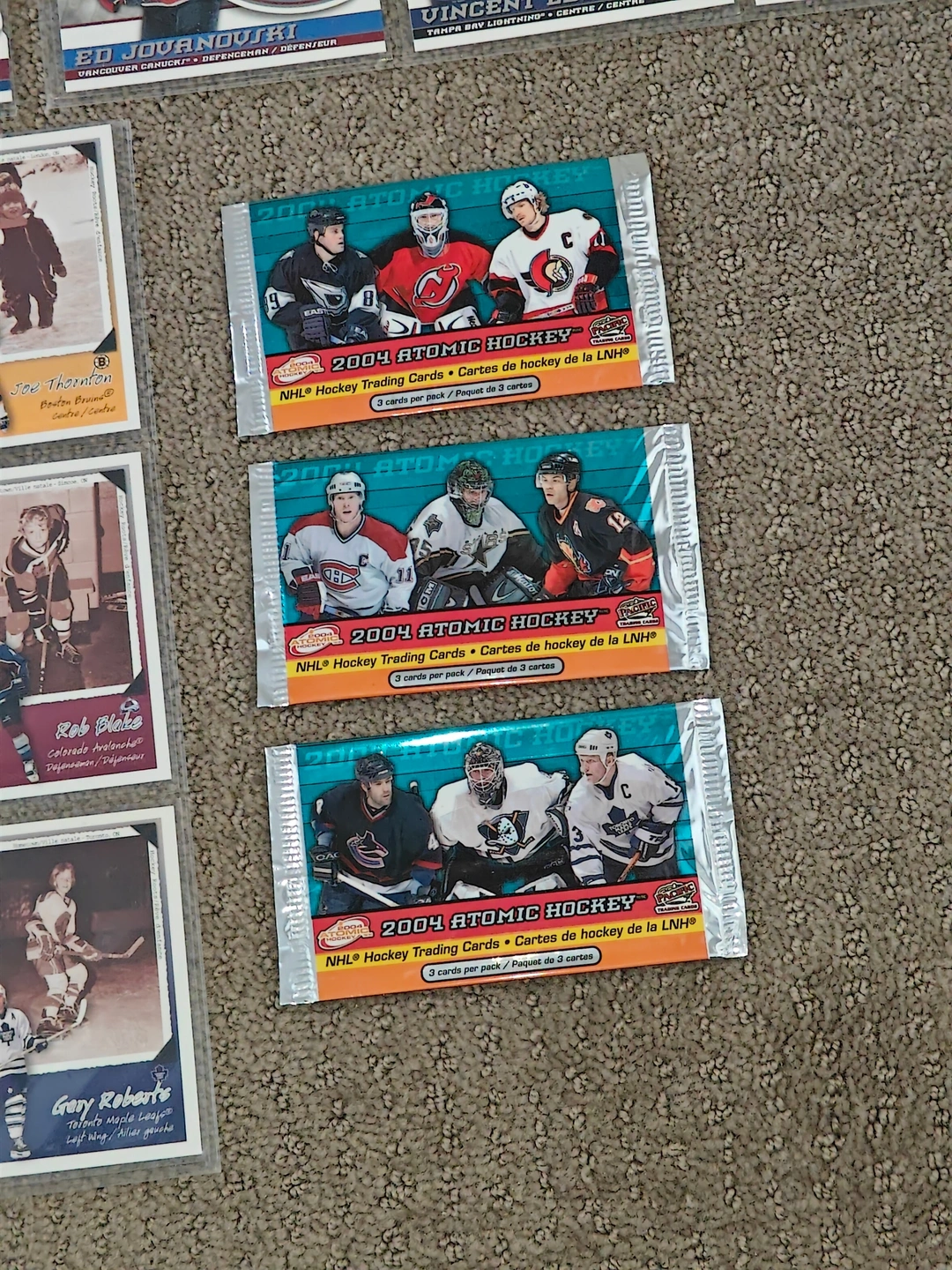 174NOTE: 2003-04 McDonalds Pacific Atomic Hockey Trading Card Set is NOT a Complete Set, please see list of cards included I am selling a partial 2003-04 McDonald's Pacific Atomic Hockey Trading Cards in excellent condition. Includes: * 26 Card Count * 3 Ultra ProTrading Card Sleeves * 3 Opened Empty Foil Packs * 6 - Drury * 7 - Iginla * 10 - Forsberg * 11 - Hejouk * 12 - Kariya * 18 - Joseph * 21 - Comrie * 22 - Laraque * 24 - Bouwmeester * 26 - Gaborik * 34 - Messier * 35 - Alfredsson * 36 - Hossa * 37 - Lalime * 44 - Lecavalier * 47 - Domi * 51 - Bertuzzi * 52 - Jovanovski * 55 - Jagr Hockey Roots Checklist cards: * 1 - Heatley * 2 - Thornton (2 Cards) * 4 - Blake * 8 - LeCavalier * 9 - Richards * 10 - Roberts Comes from a pet and smoke-free environment. Pickup in Mount Pleasant (NW Calgary)
