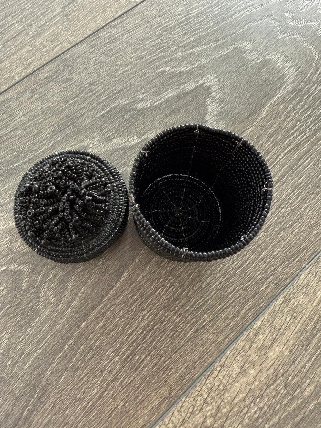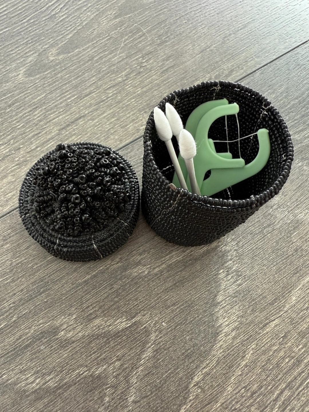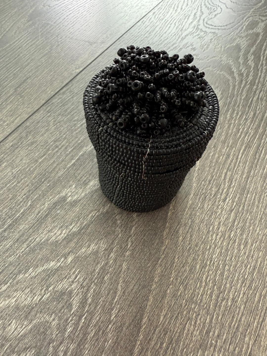 This is a cute little trinket box made of black beads. It comes with a matching lid and is perfect for storing small items like jewelry or cotton swabs!