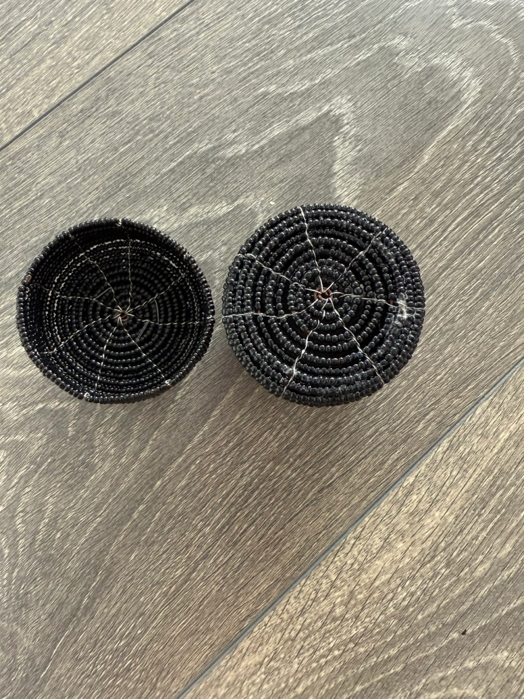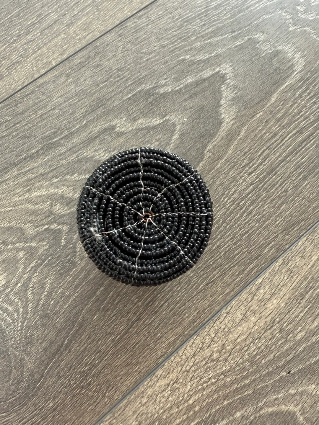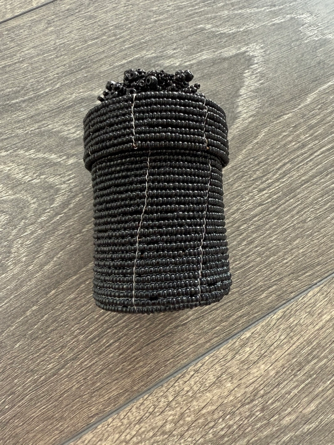 This is a cute little trinket box made of black beads. It comes with a matching lid and is perfect for storing small items like jewelry or cotton swabs!