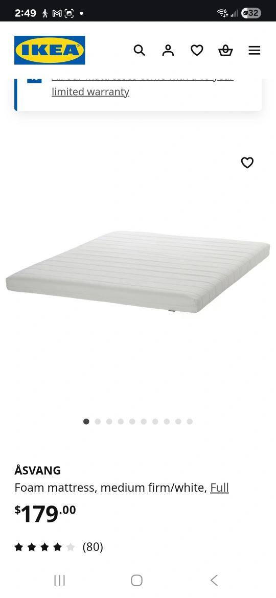 80Selling a brand new IKEA ÅSVANG full-size foam mattress, still in its original packaging! It's a medium-firm mattress in white. Dimensions are 53 1/8 x 74 3/8 x 4 3/4". It weighs 22.92 lbs. Retails for $179. Still in package