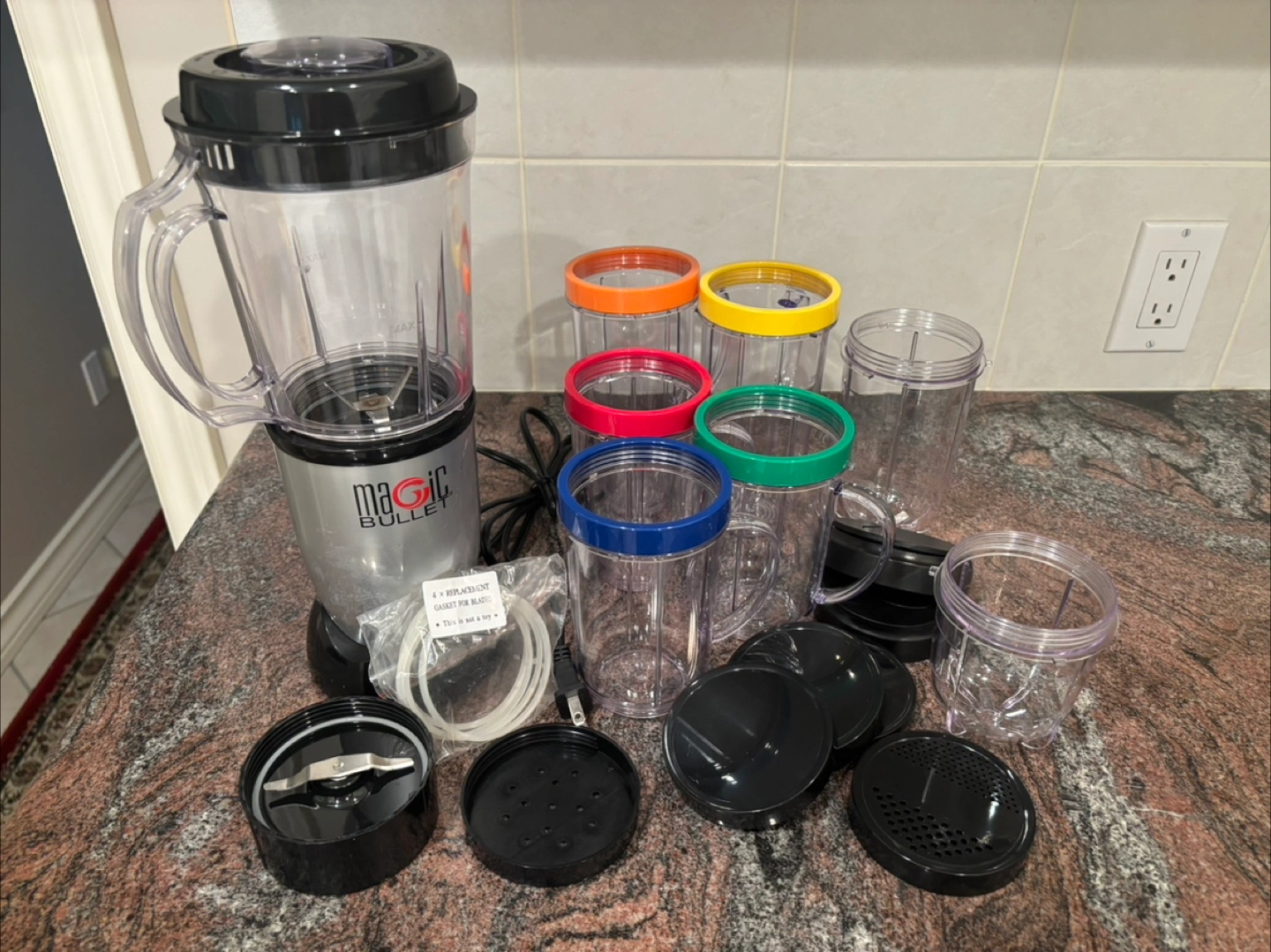 Selling a complete Magic Bullet blender set. It comes with a variety of cups and lids, including some with coloured rims. Also included are the blade attachments and replacement gaskets for the blades. Great for making smoothies or quick food prep!