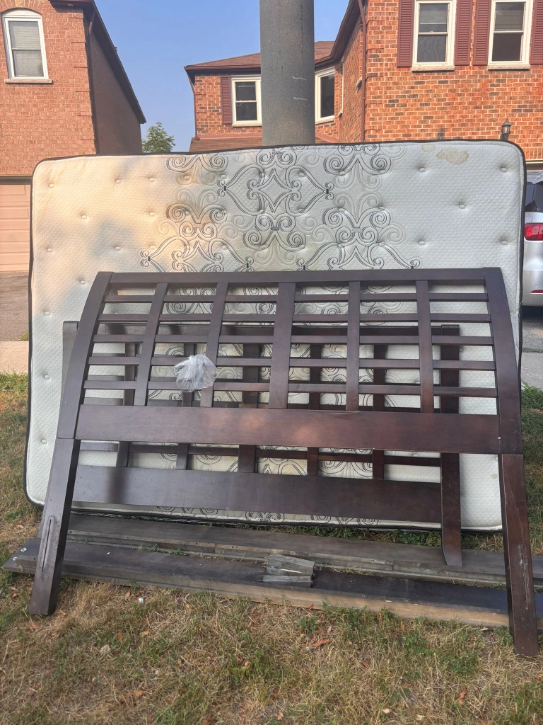 free queen-sized bed frame and mattress. The frame is a dark brown colour. The mattress has a patterned design on top. Good for a guest room or starter set! needs to be gone asap.