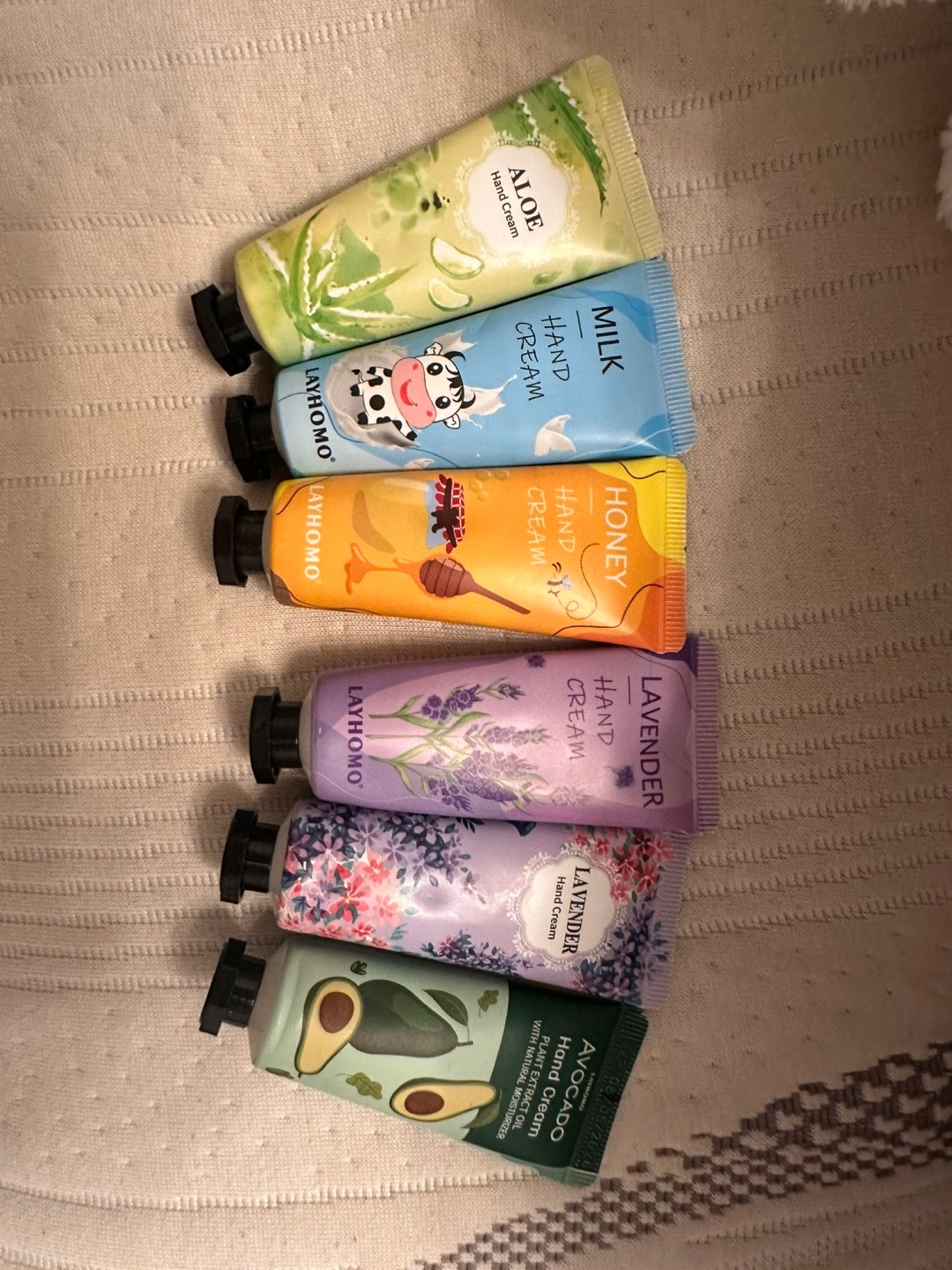 Selling a set of LAYHOMO hand creams! The set includes Aloe, Milk, Honey, Lavender, and Avocado scents. Perfect for keeping your hands moisturized and smelling great!