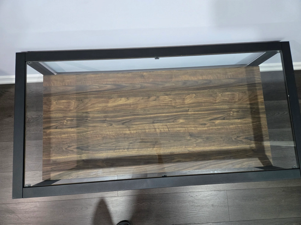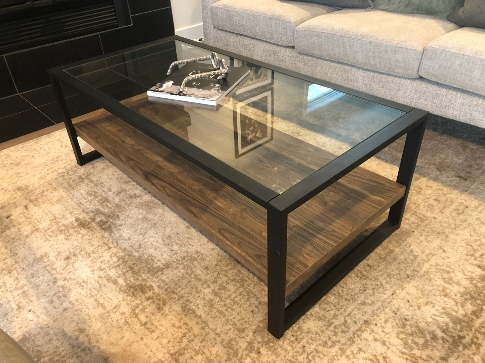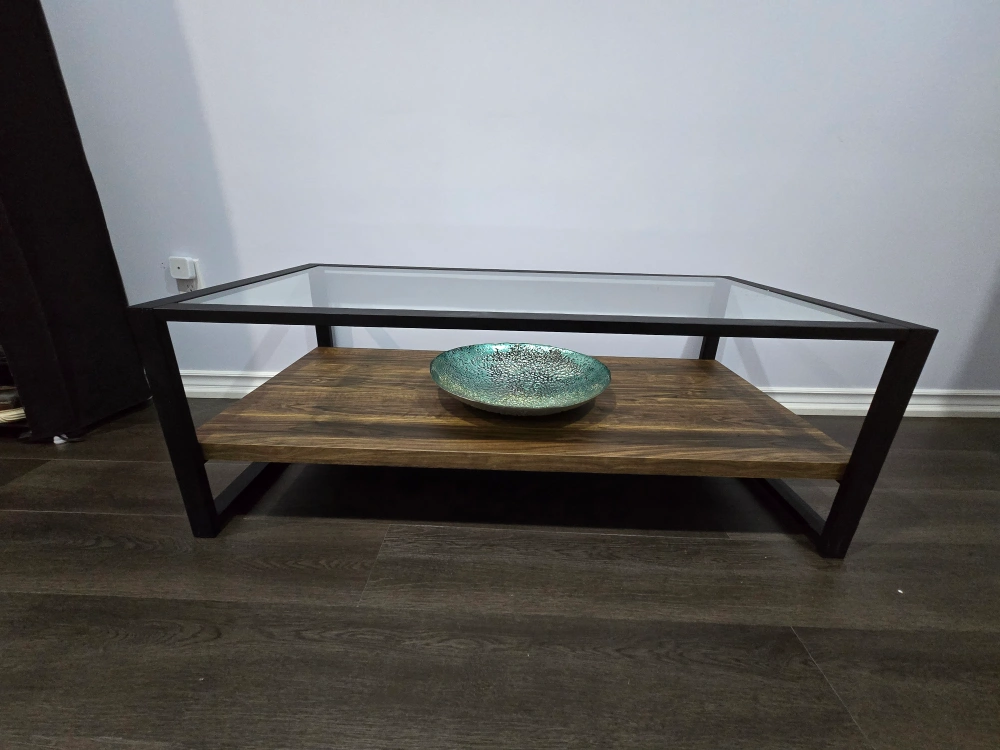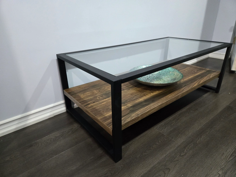Selling a coffee table with a glass top and a wooden shelf underneath. It's in great shape and would look lovely in any living room or den! The sleek design with the black frame is super stylish and modern and sturdy.