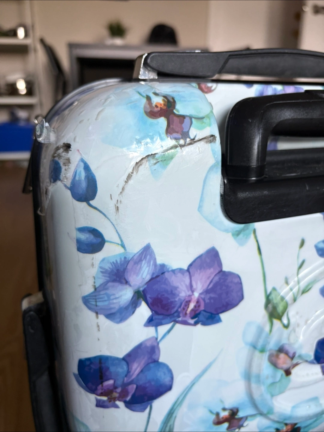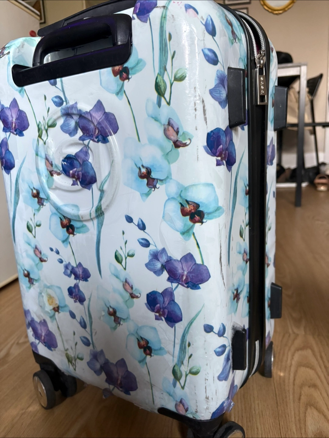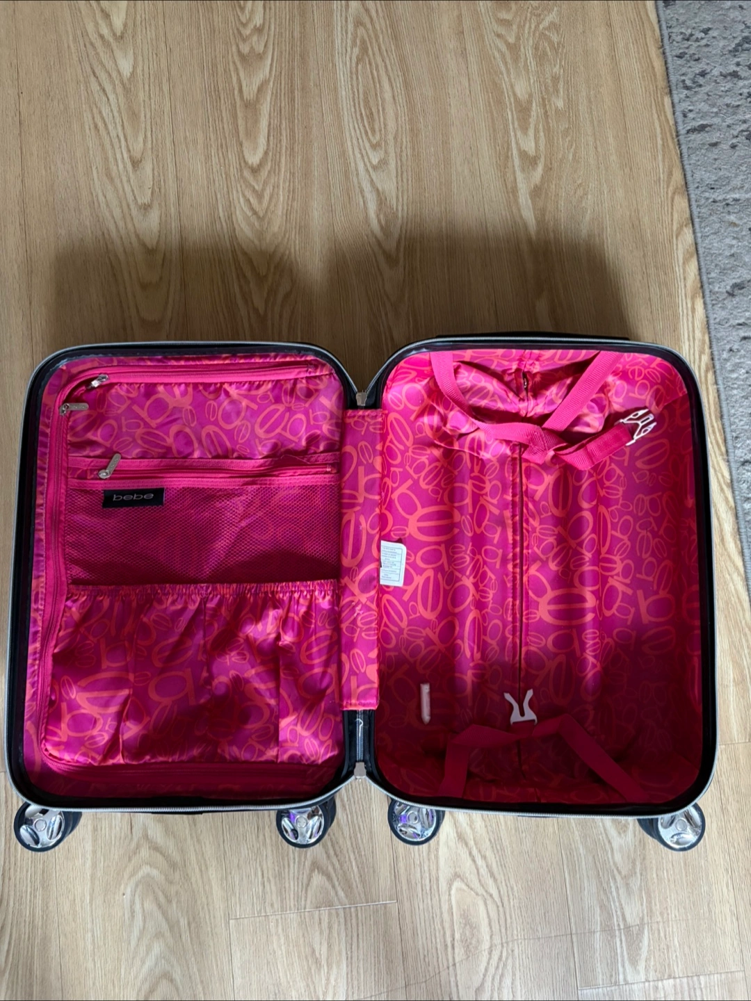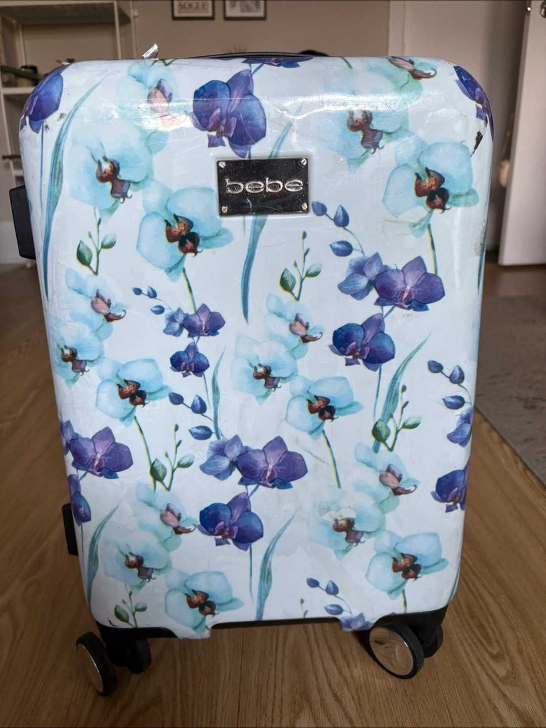 Selling a well loved Bebe carry-on suitcase with a pretty floral design! Visible wear on the outside, interior in great condition