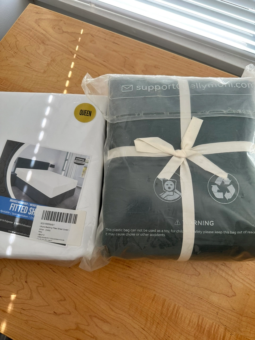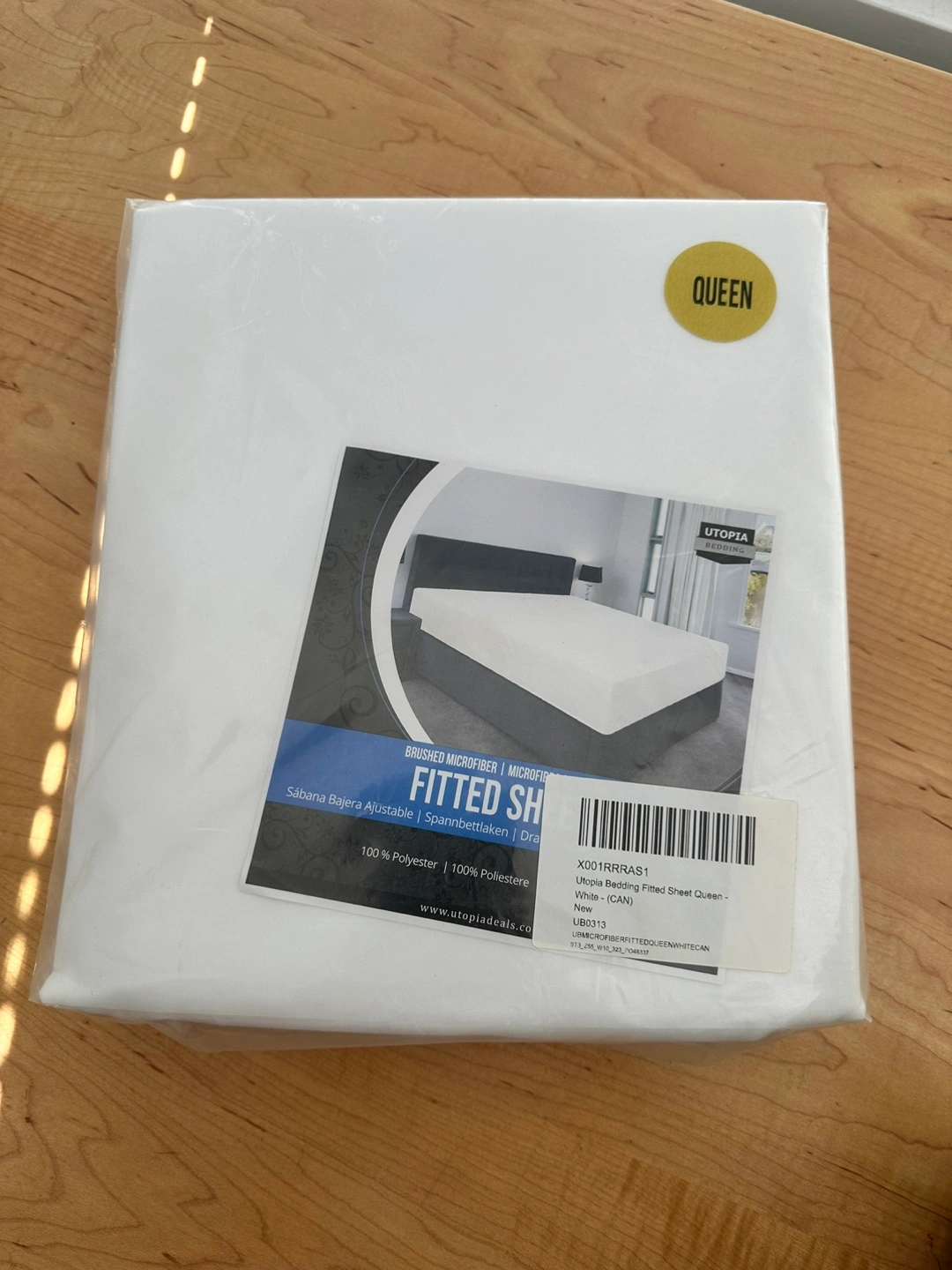 Selling a brand new white queen-size fitted sheet set from Utopia, still in its original packaging! Also included is a teal color duvet sheet set, nicely wrapped with a bow.