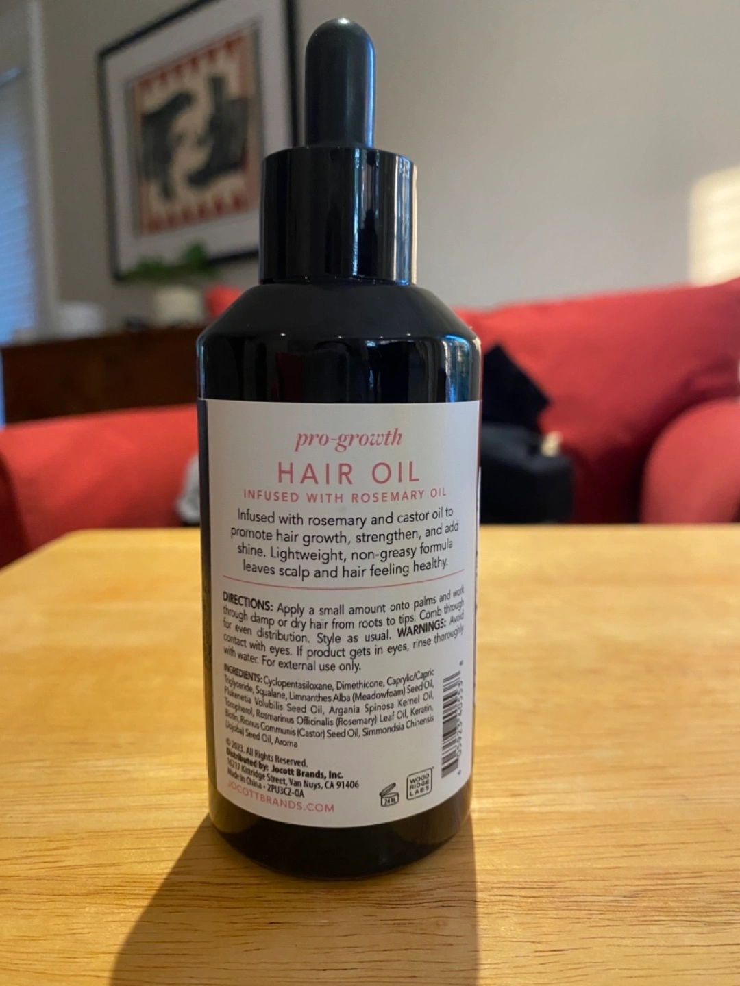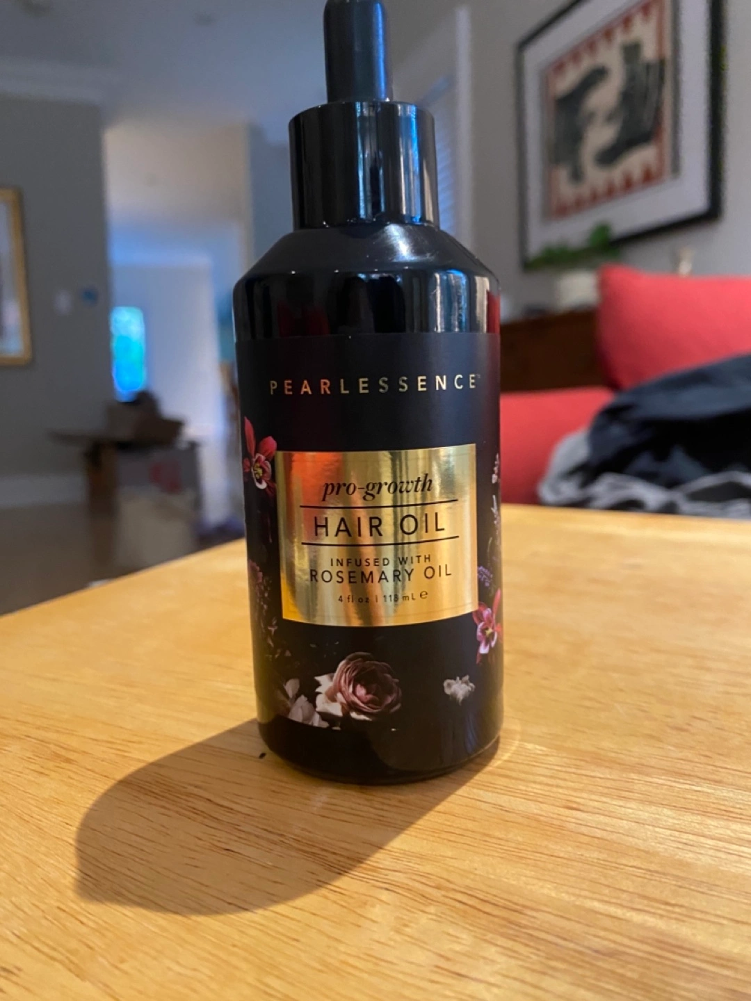 bottle of Pearlessence Pro-Growth Hair Oil, infused with rosemary oil!