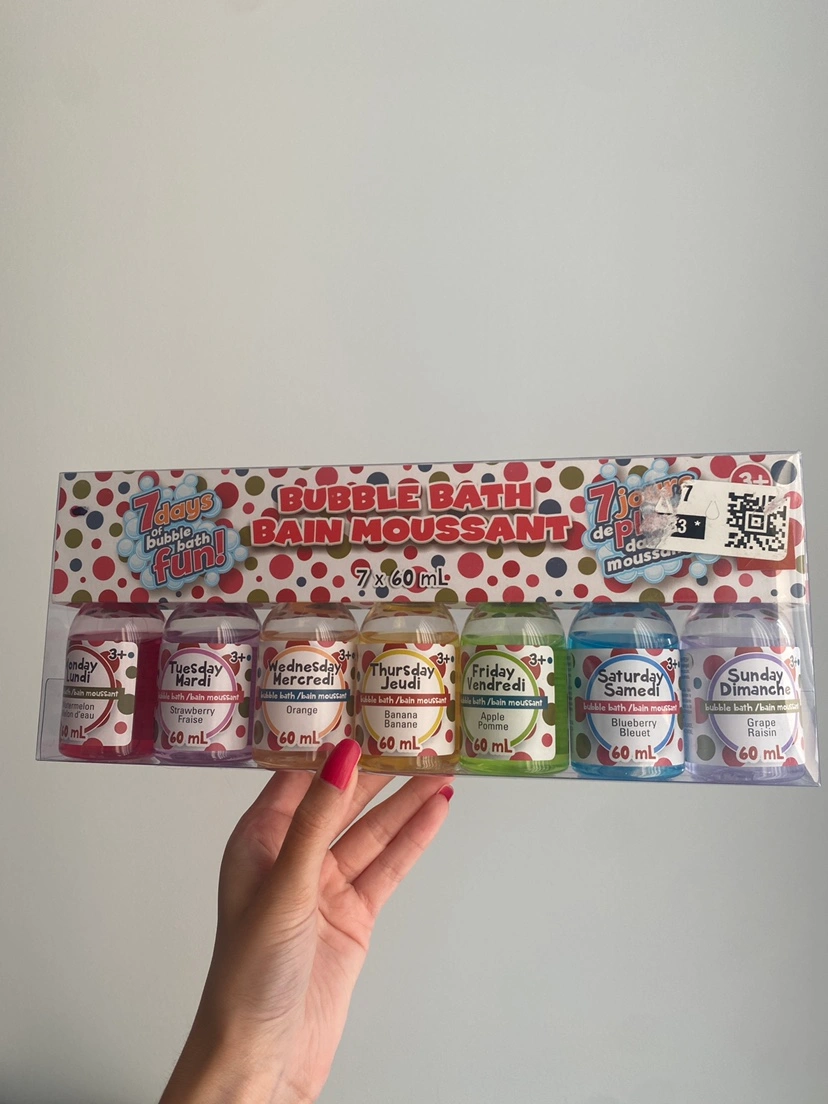 Brand new unopened 7 Days Bubble Bath set! It comes with 7 bottles, each 60ml, with different scents for each day of the week. Scents include watermelon, strawberry, orange, banana, apple, blueberry, and grape. Perfect for kids aged 3+