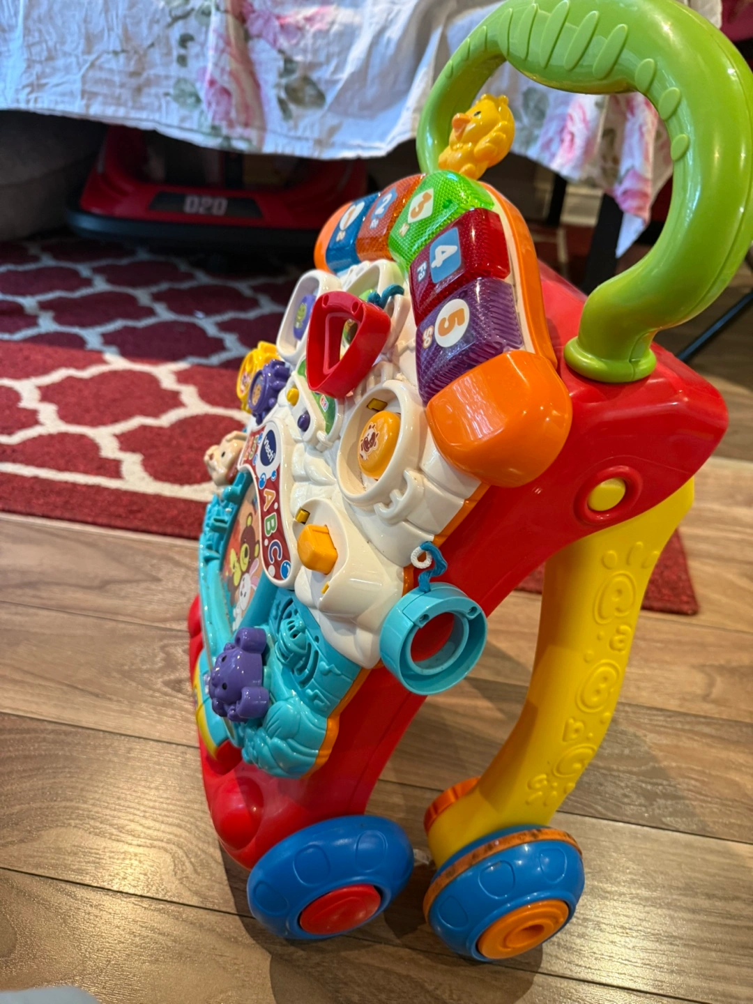 I'm selling a VTech Stroll & Discover Activity Walker! It's in great shape and ready for a new home. This interactive walker is perfect for little ones learning to walk and explore. It features a variety of engaging activities, sounds, and songs to keep your child entertained while developing their motor skills. Great for ages 9-36 months