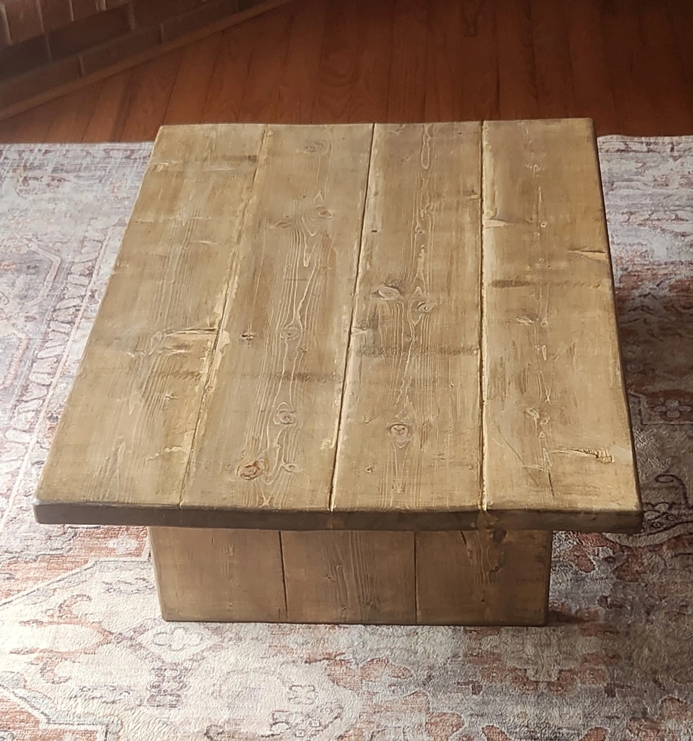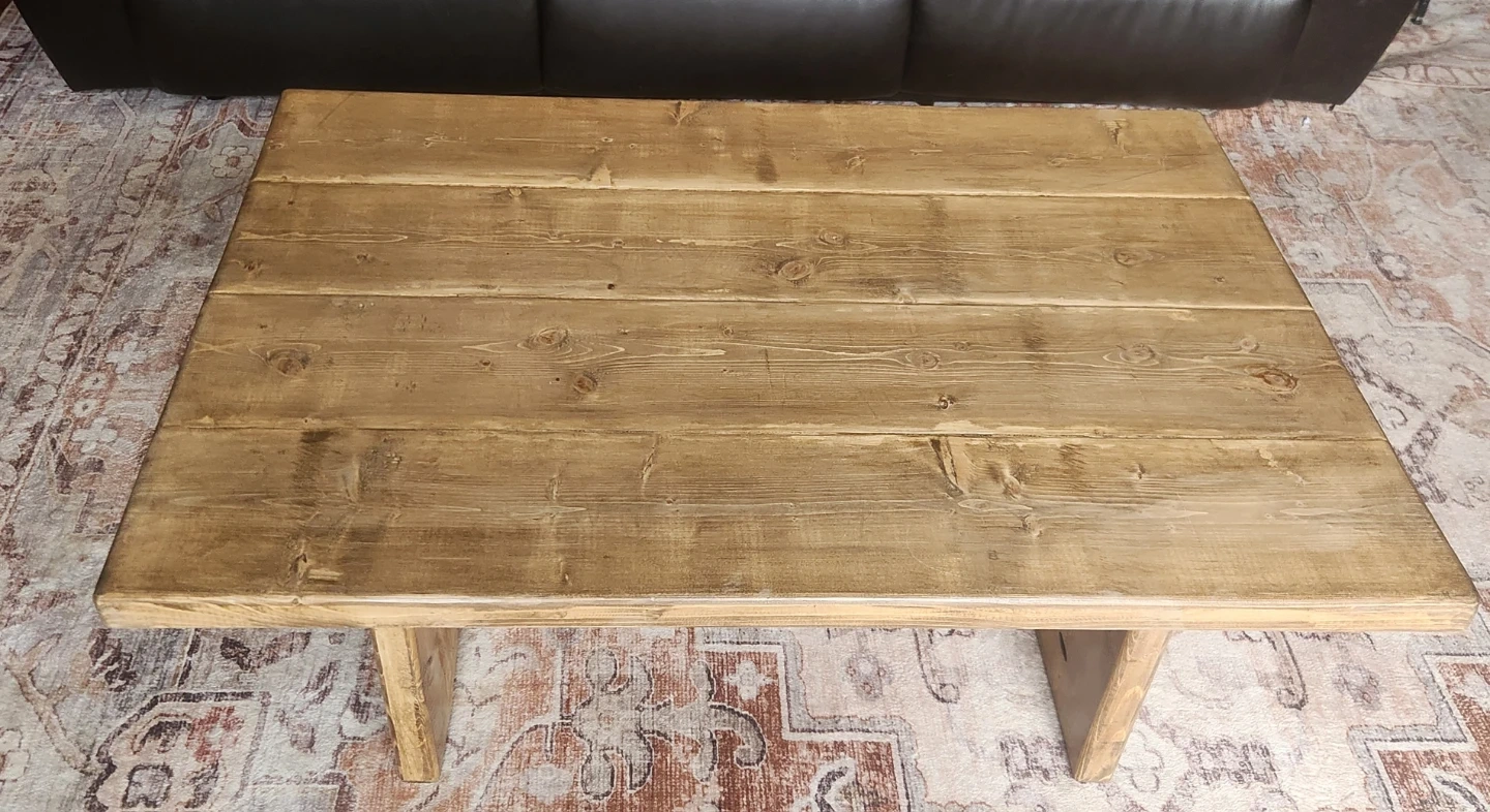 A rustic coffee table with a natural wood finish. It's made of solid wood planks. This table would be a great centrepiece for a living room!