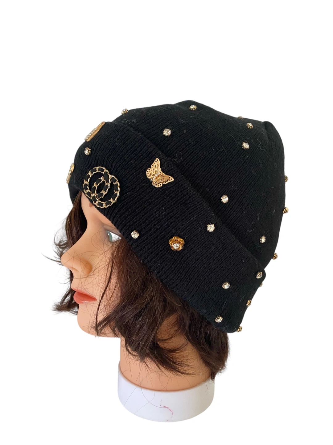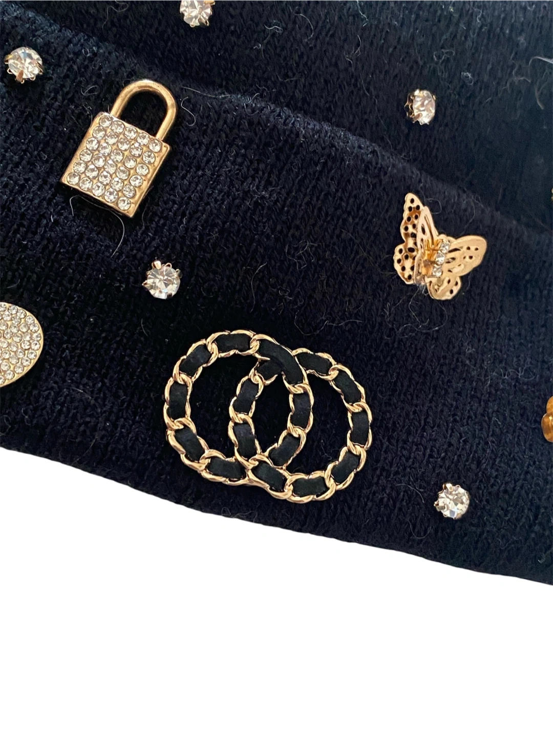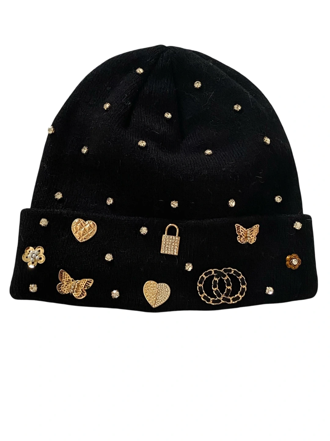 This black knitted beanie is adorned with sparkling rhinestones and charming gold tone embellishments like butterflies, hearts, and locks. It's a cozy and stylish accessory for cooler weather. Keeps your head warm and adds a bit of flair to any outfit!