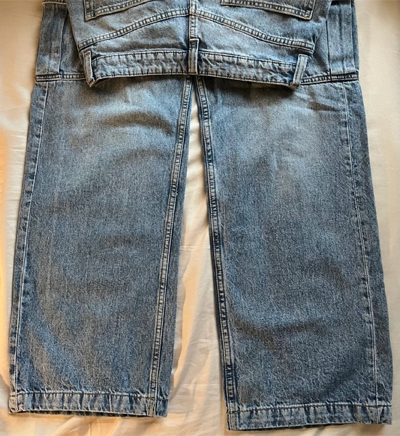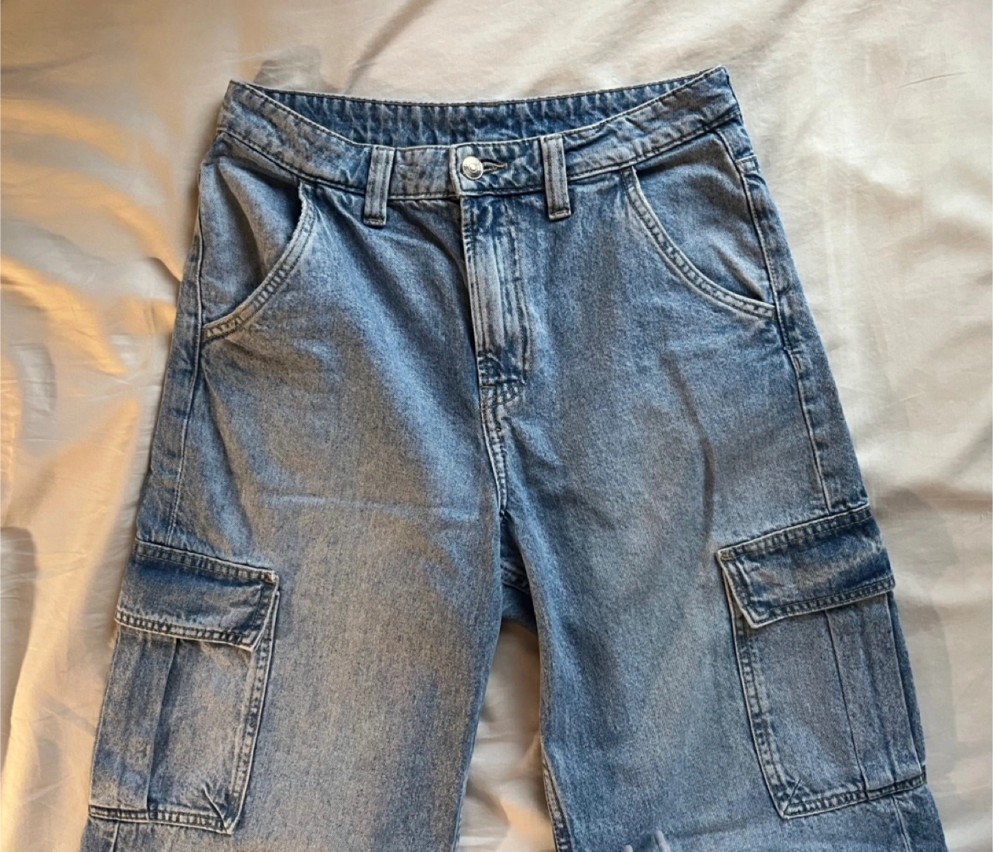 Women's light wash denim cargo jeans. Loose fit. Multiple pockets. Good condition.