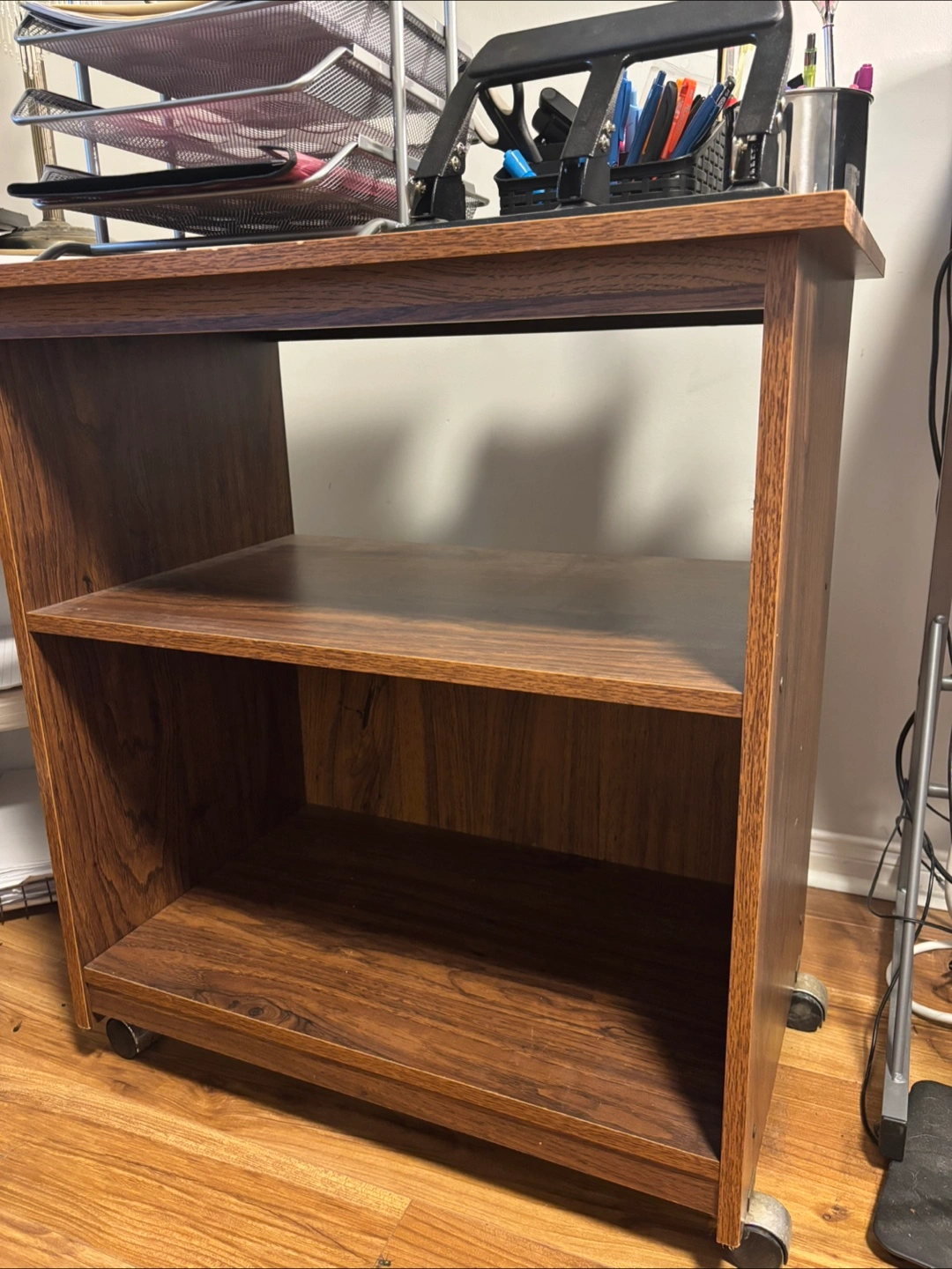 Selling a brown wooden rolling cart. It features two shelves and is on wheels for easy movement. Perfect for adding extra storage to any room! Great for printer and paper in home office.
