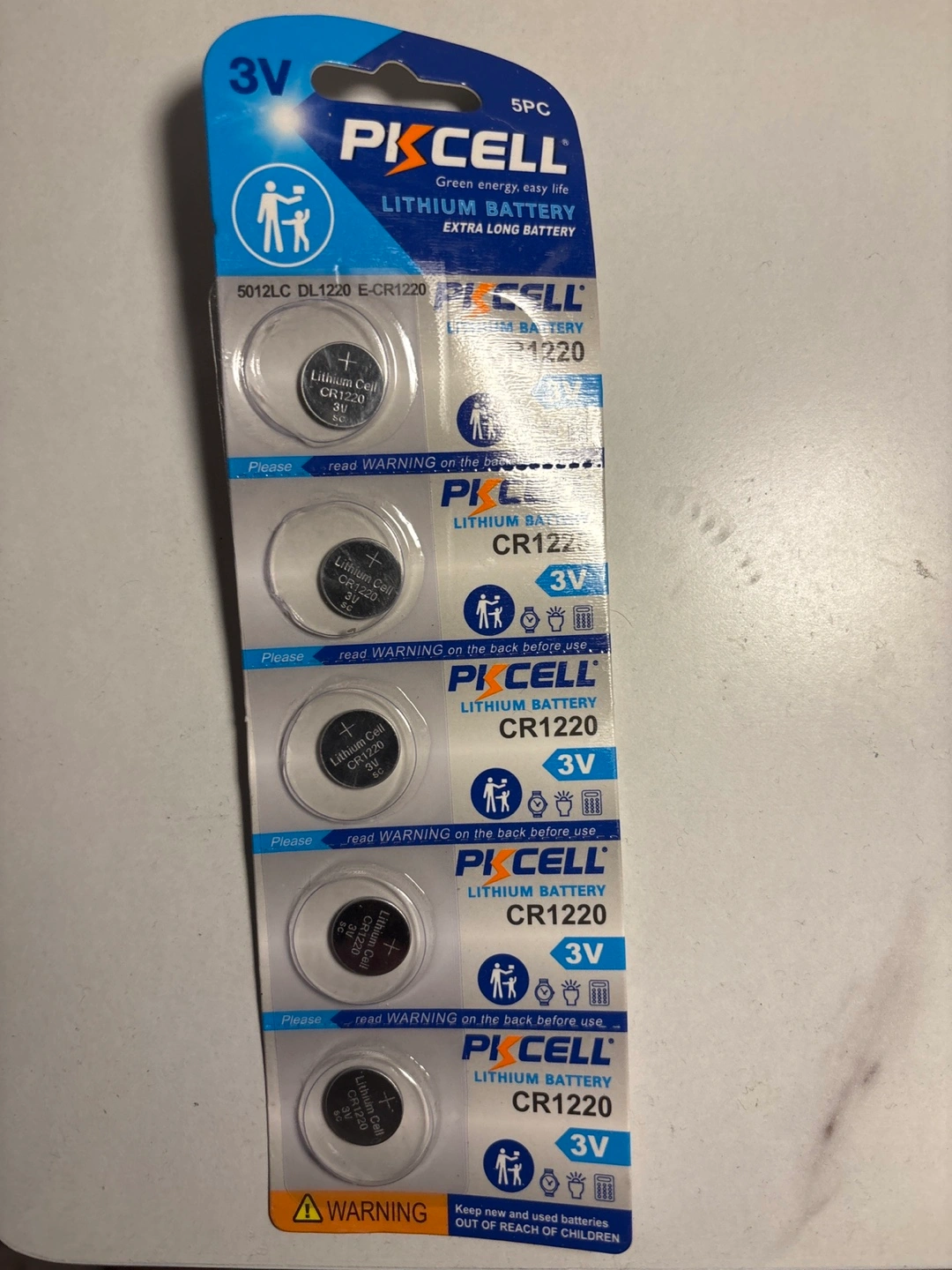 751I'm selling a brand new pack of PKCELL CR1220 3V lithium batteries! This pack includes 5 batteries, perfect for watches, calculators, and other small electronics. Keep new and used batteries out of reach of children Cash and pick up only .