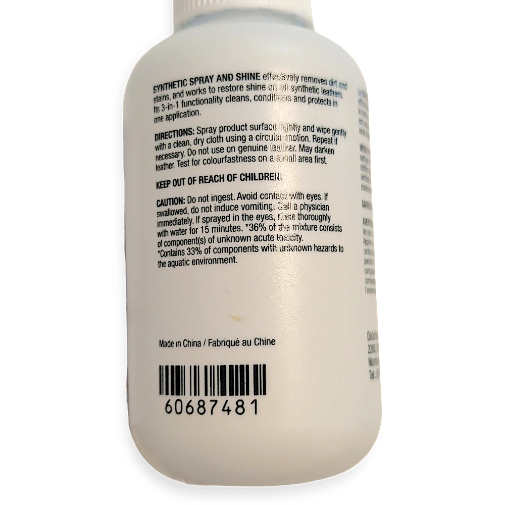 Selling a bottle of Novi Synthetic Spray & Shine! It effectively removes dirt and stains, and works to restore shine on all synthetic leathers. Its 3-in-1 functionality cleans, conditions, and protects in one application. The bottle contains 118 mL (4.0 oz)