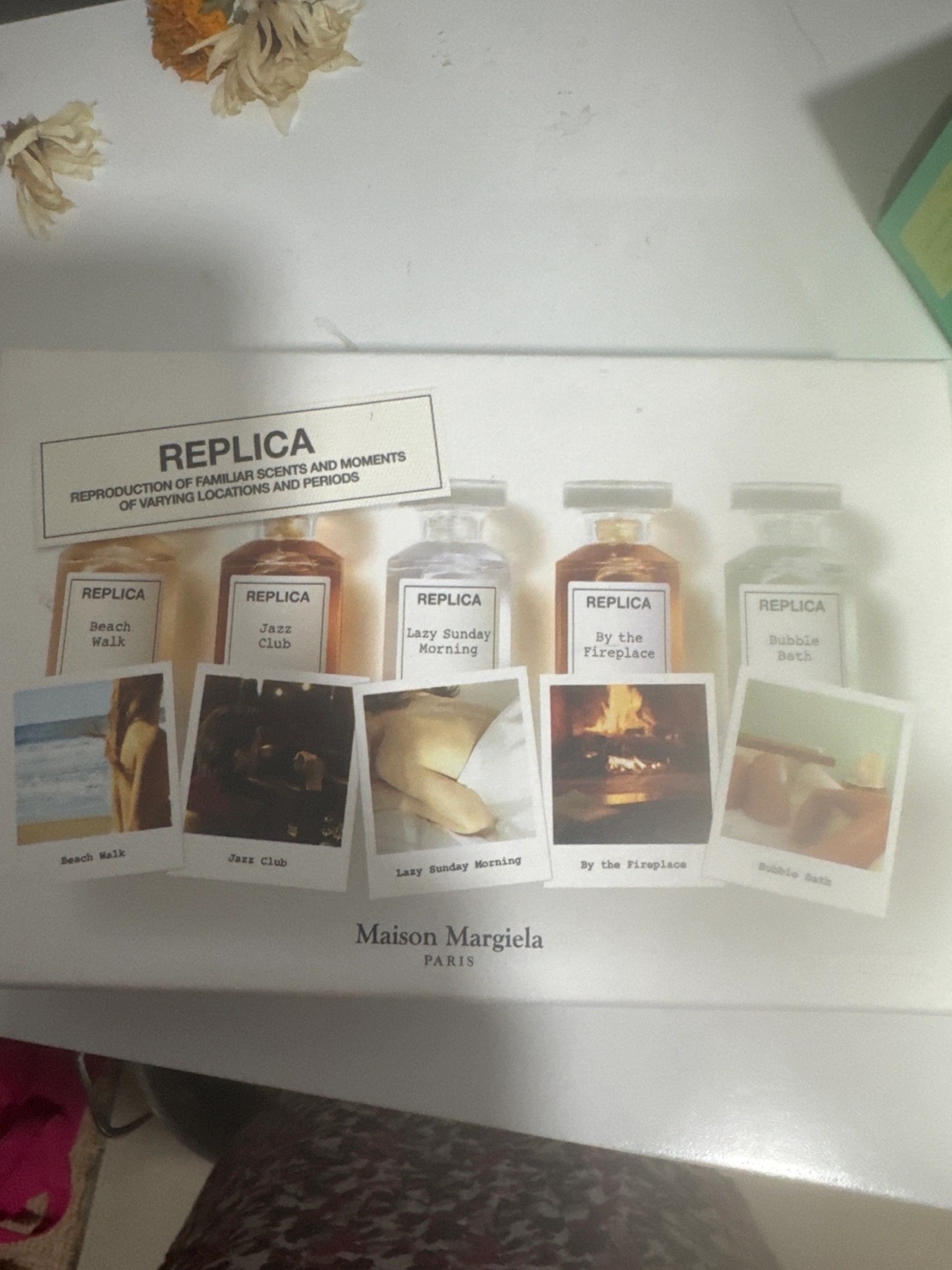 Selling a Maison Margiela REPLICA mini fragrance set! It includes five mini fragrances: Beach Walk, Jazz Club, Lazy Sunday Morning, By the Fireplace, and Bubble Bath. Perfect for trying out different scents!