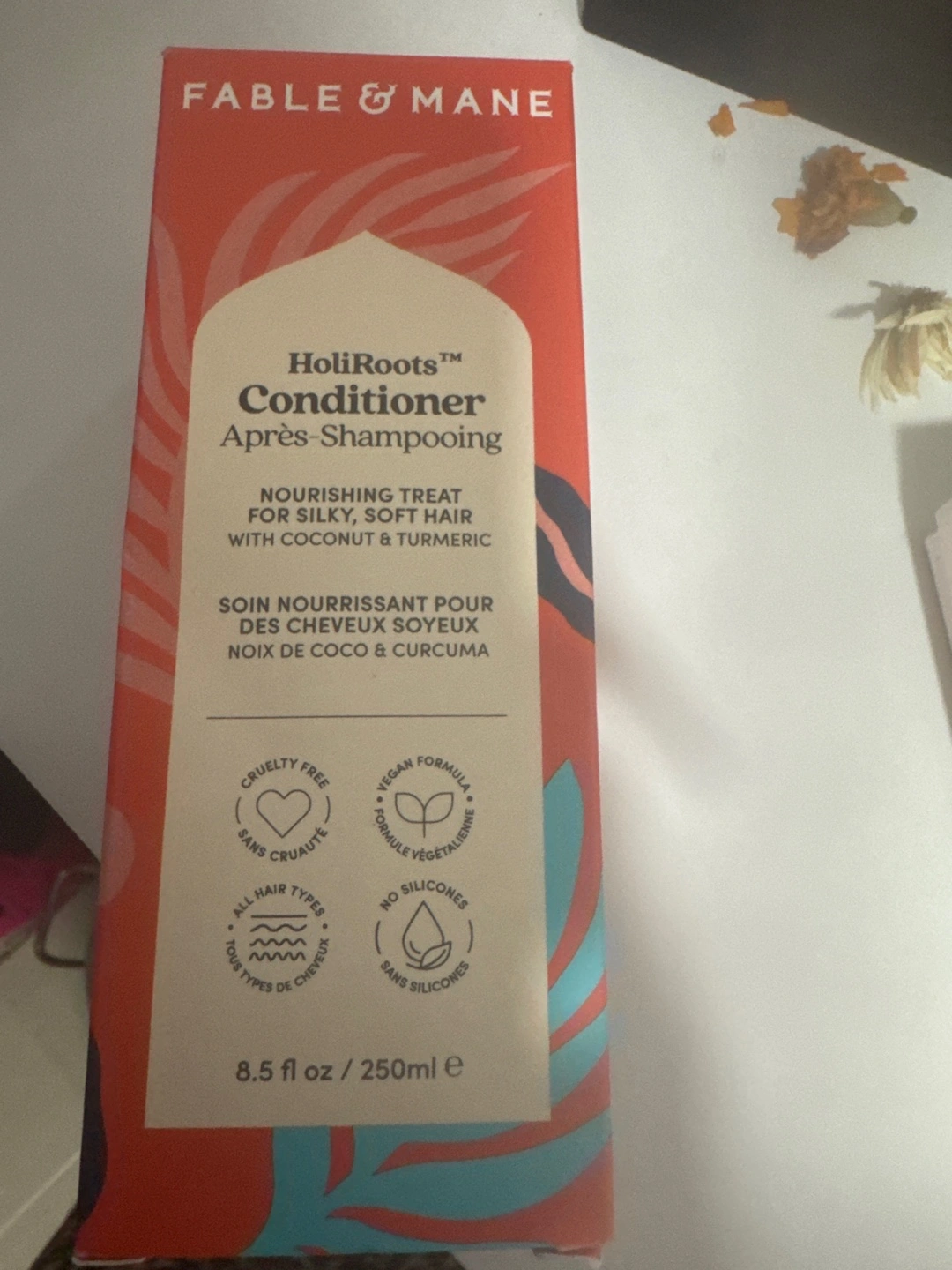Selling a bottle of Fable & Mane HoliRoots Conditioner. This nourishing treatment is designed to give you silky, soft hair with the goodness of coconut and turmeric. It's cruelty-free, vegan, and has no silicones, making it suitable for all hair types. The bottle contains 8.5 fl oz / 250ml.