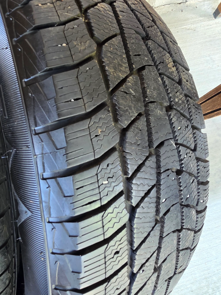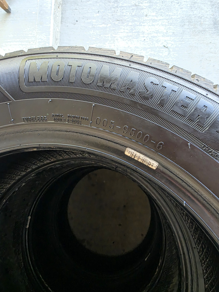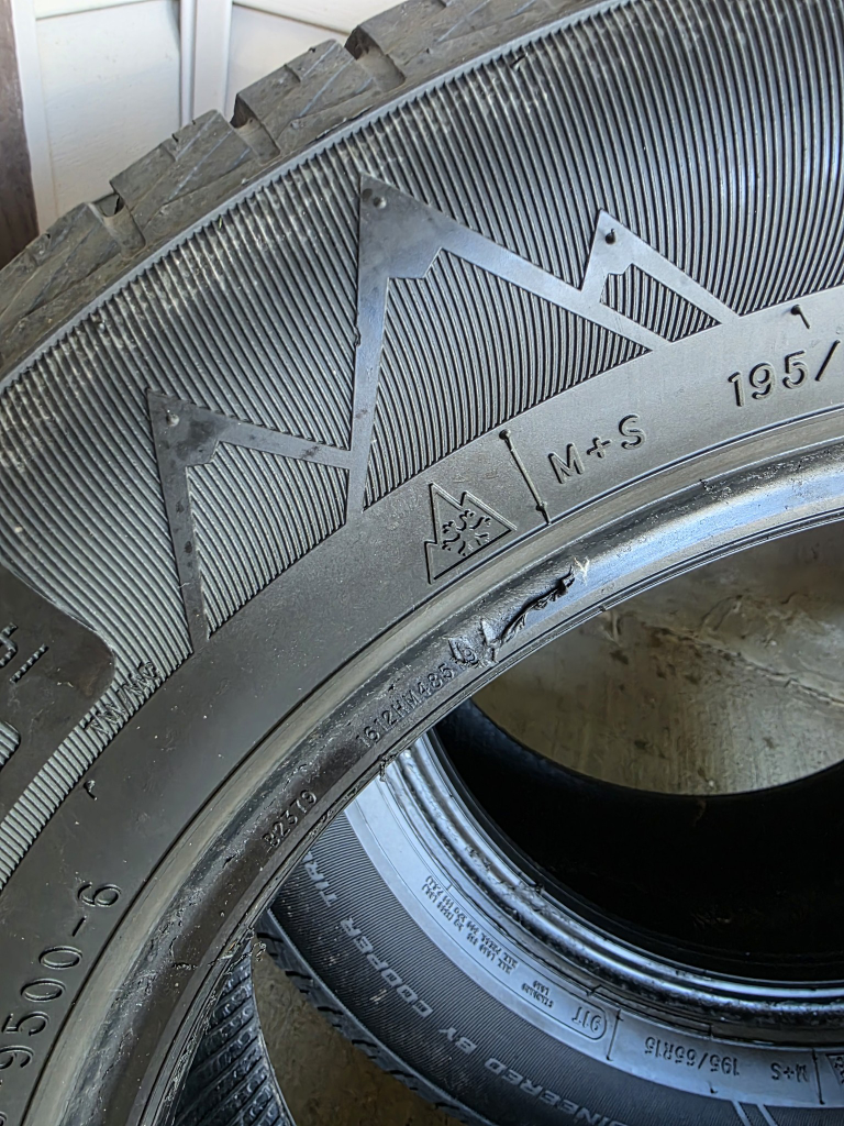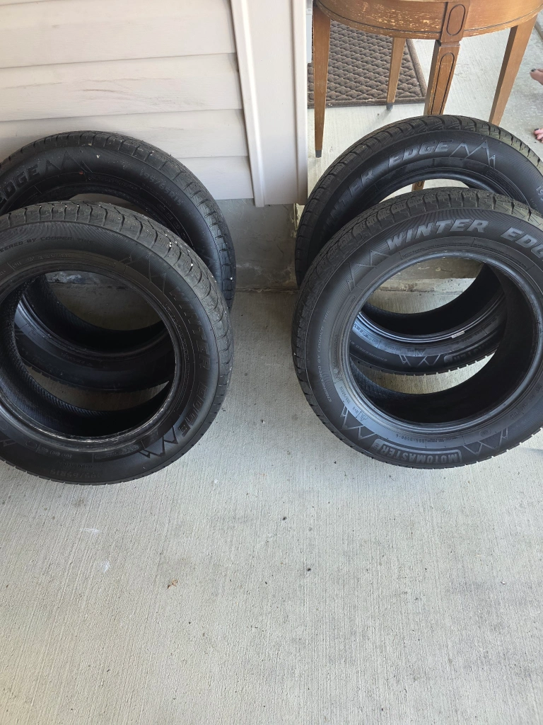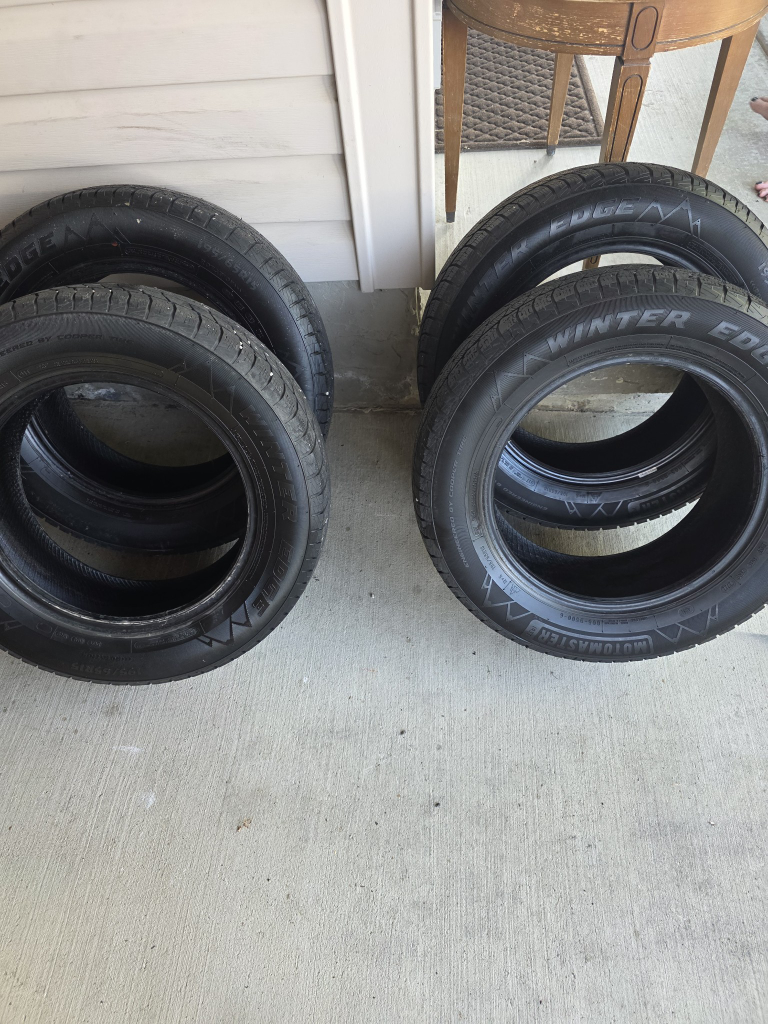 Selling a set of four Motomaster Winter Edge tires, size 195/65R15. These tires are designed for winter conditions and provide good traction on snow and ice. They are marked with the M+S symbol and the mountain snowflake symbol. Ready to keep you safe this winter season! one tire has a plug and holds air perfectly.